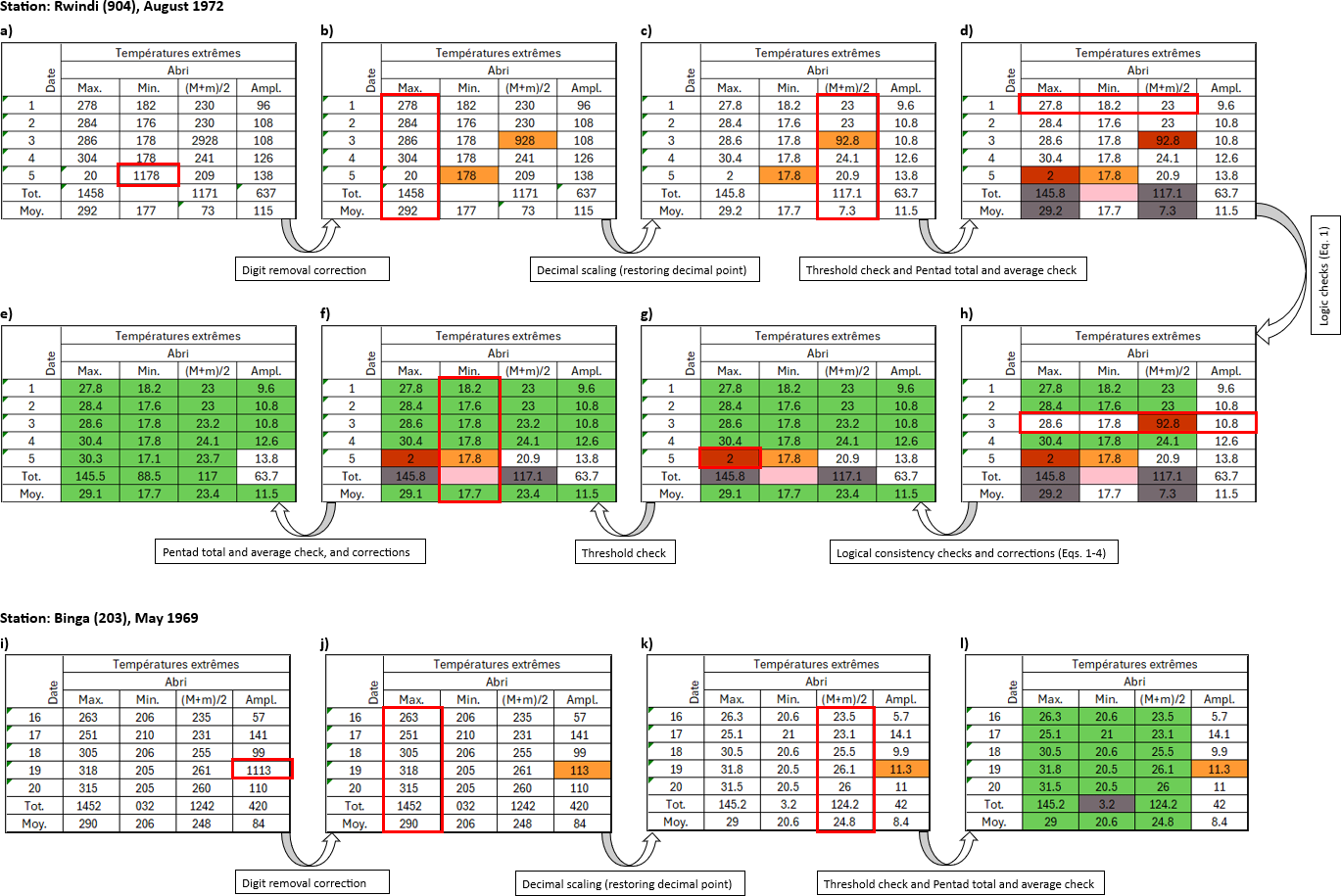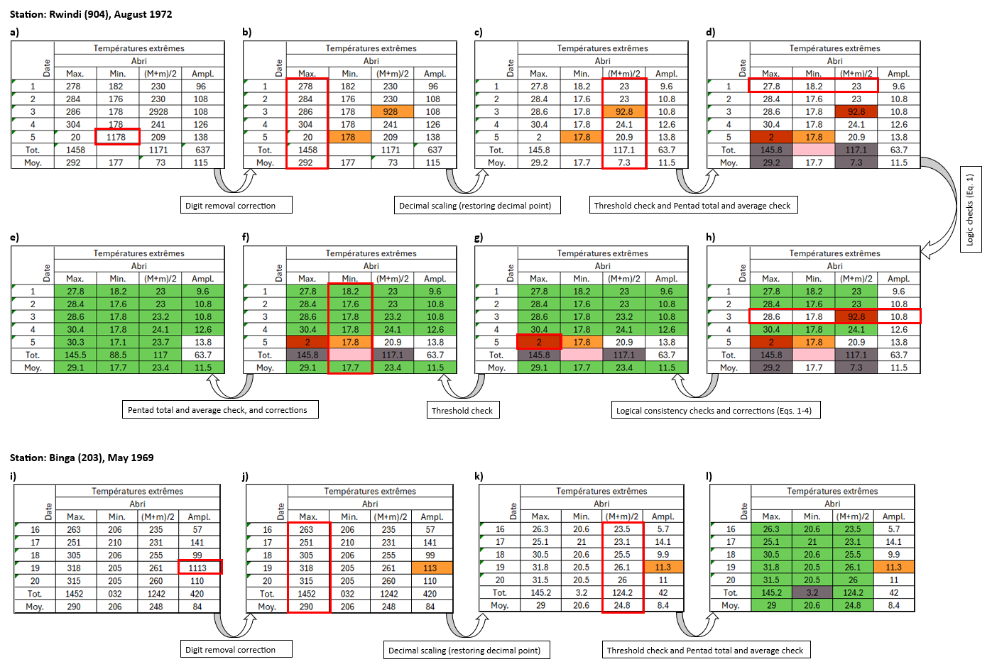 Figure 11Two examples of pentad transcribed temperature values (Top: Station Rwindi [0°47′ S, 29°17′ E], August 1972, and Bottom: Station Binga [2°18′ N, 20°30′ E], May 1969) illustrate the sequence of QA/QC checks performed on the initial transcribed values, leading to the final confirmed values (flagged in green). The arrows, along with their respective labels between each panel, indicate the specific QA/QC checks applied at each stage for the pentad, corresponding to the procedures and equations described in Sect. 3.5 and illustrating the progression of the QA/QC workflow. Red-bordered cells, rows, or columns highlight examples where unconfirmed transcribed values were identified and corrected during QA/QC, with changes reflected in the subsequent panel. See Key for all colors (quality flags) in Fig. 10.