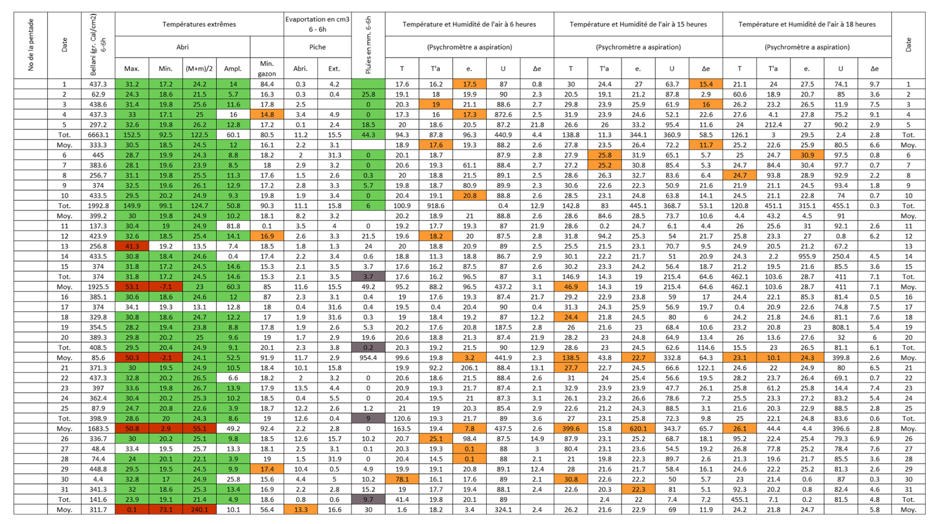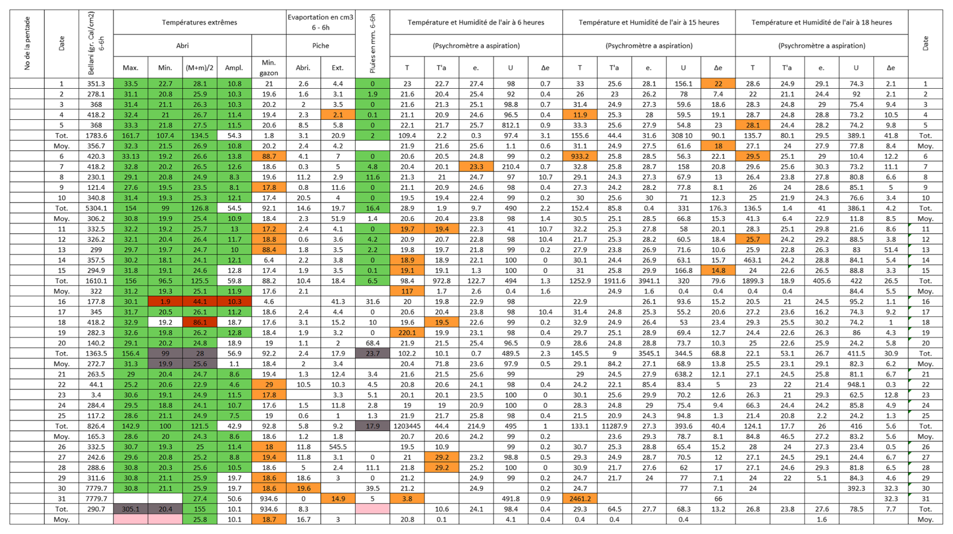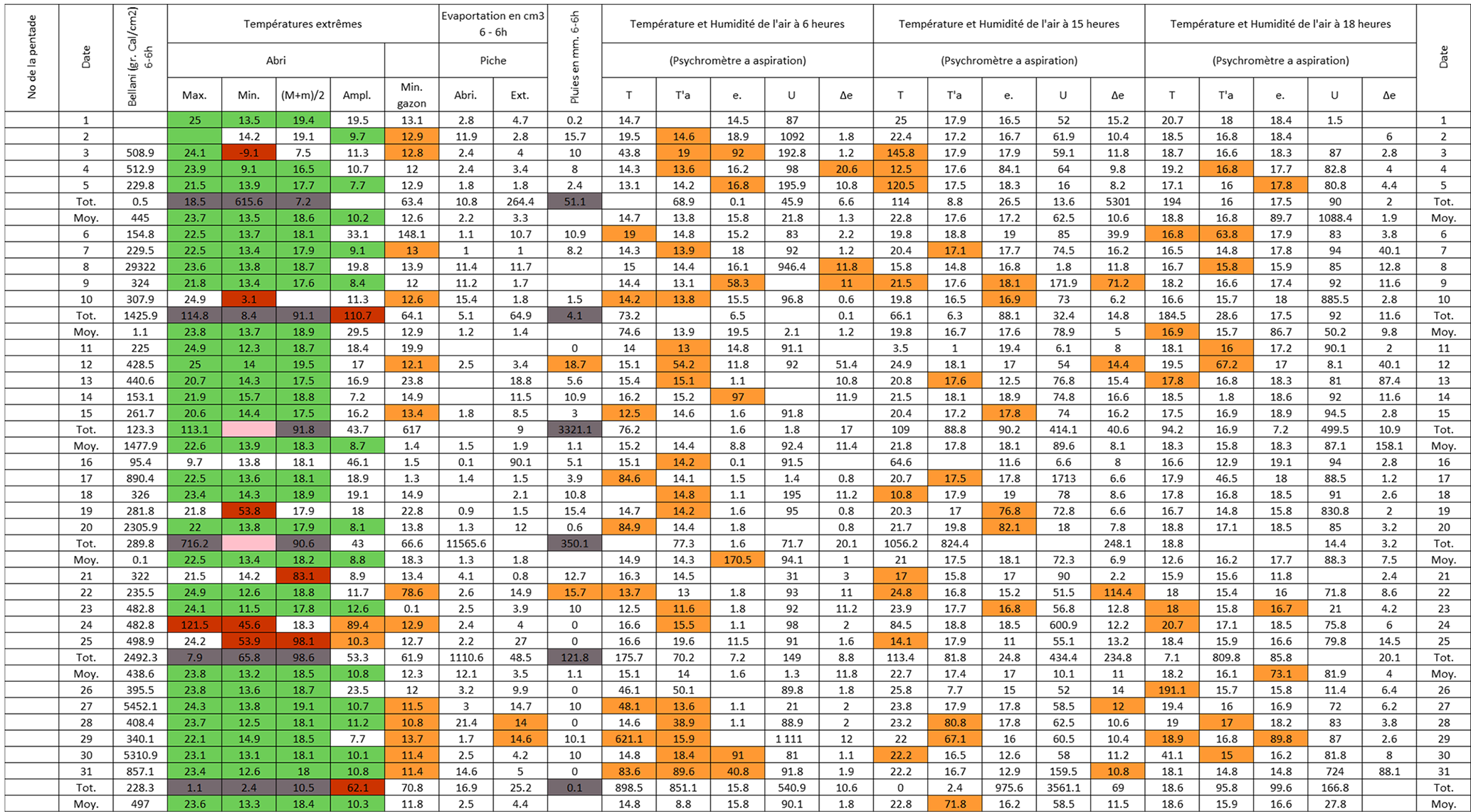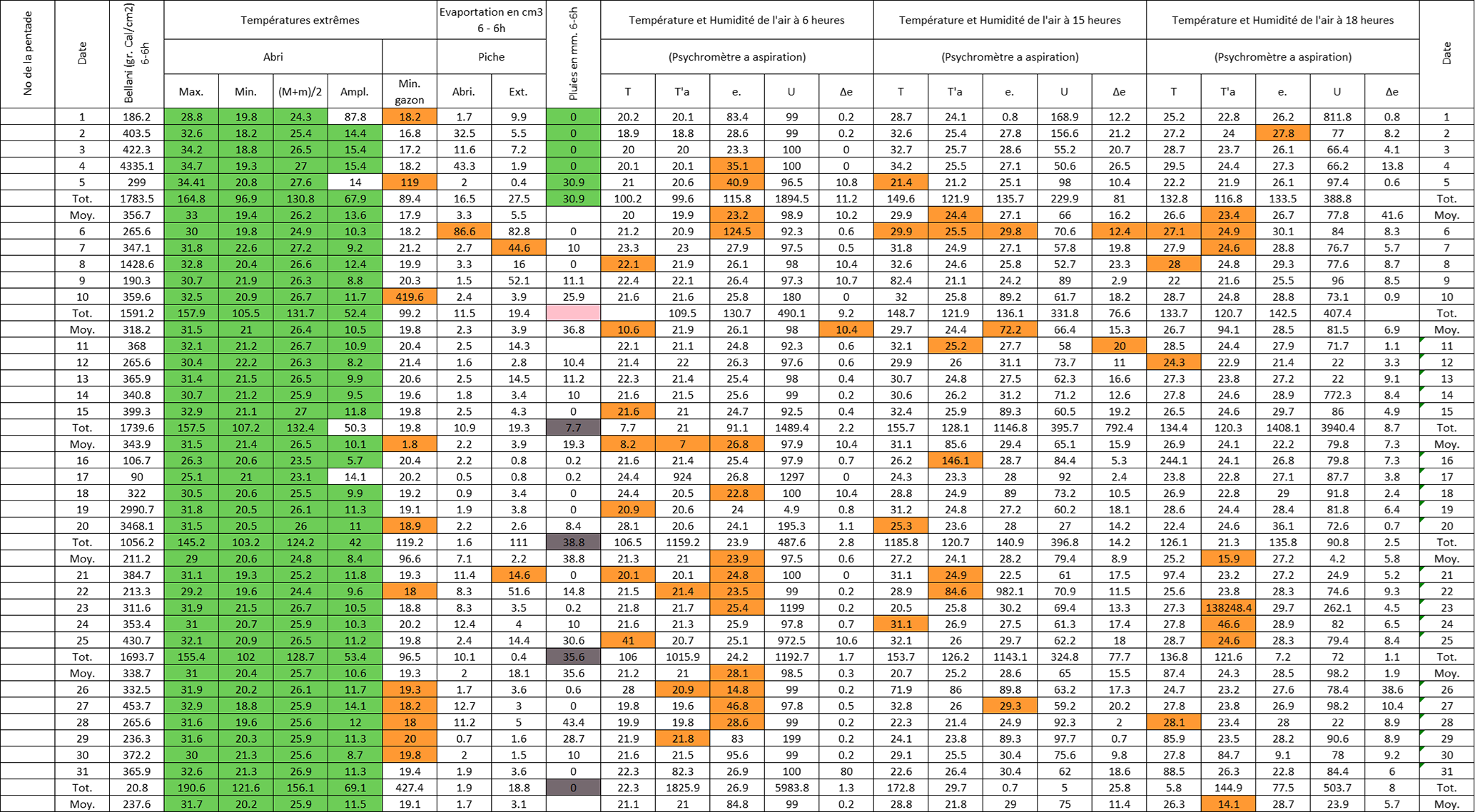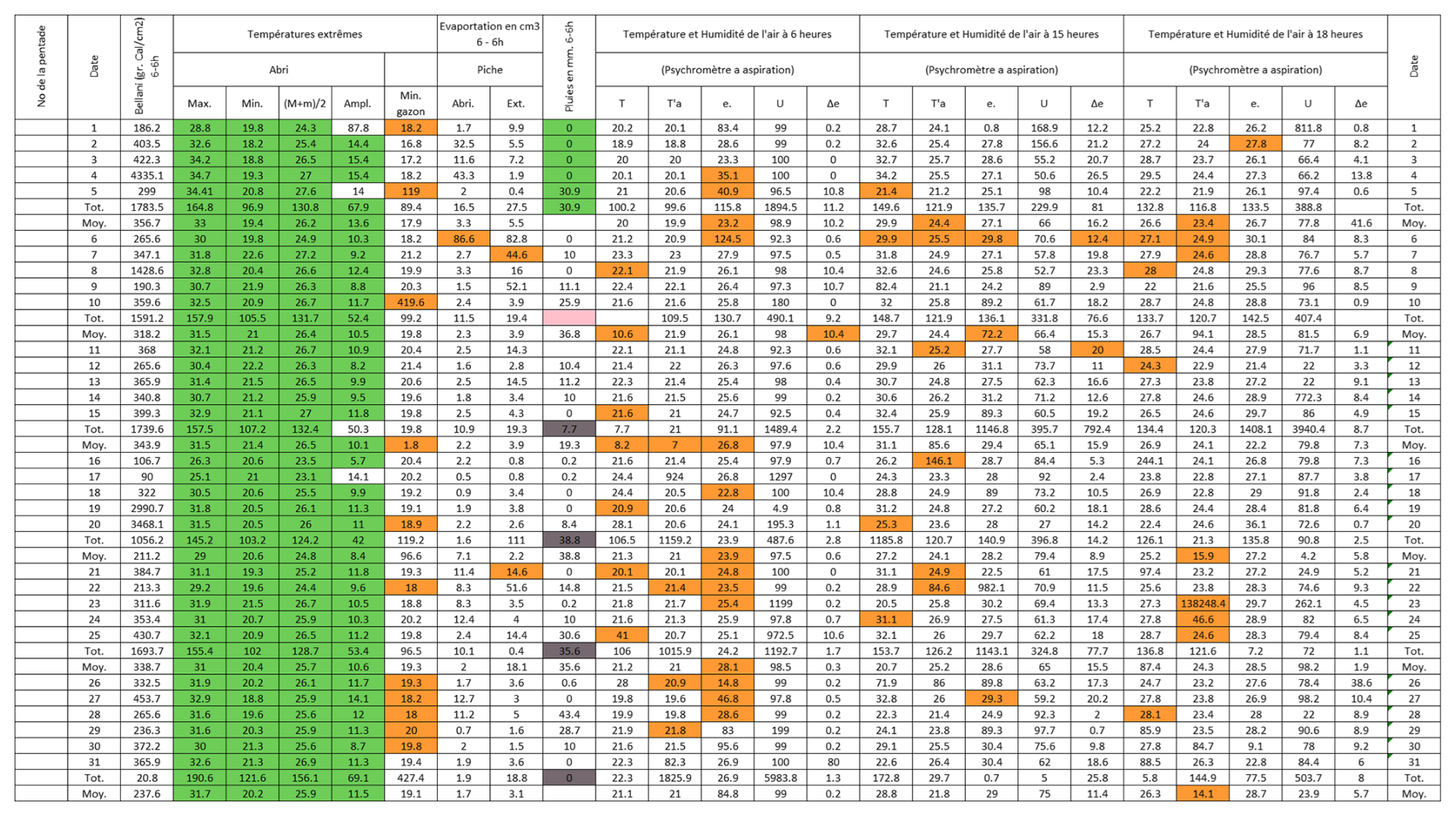 Figure B3Post-quality controlled table using MeteoSaver, showing confirmed values of daily maximum, minimum and average temperature, diurnal temperature range, and daily precipitation (highlighted in green) for the Station Kisanga-Plateau in October 1972 (Fig. A3). The description of the colors in the post-quality controlled table is given in Fig. 10.