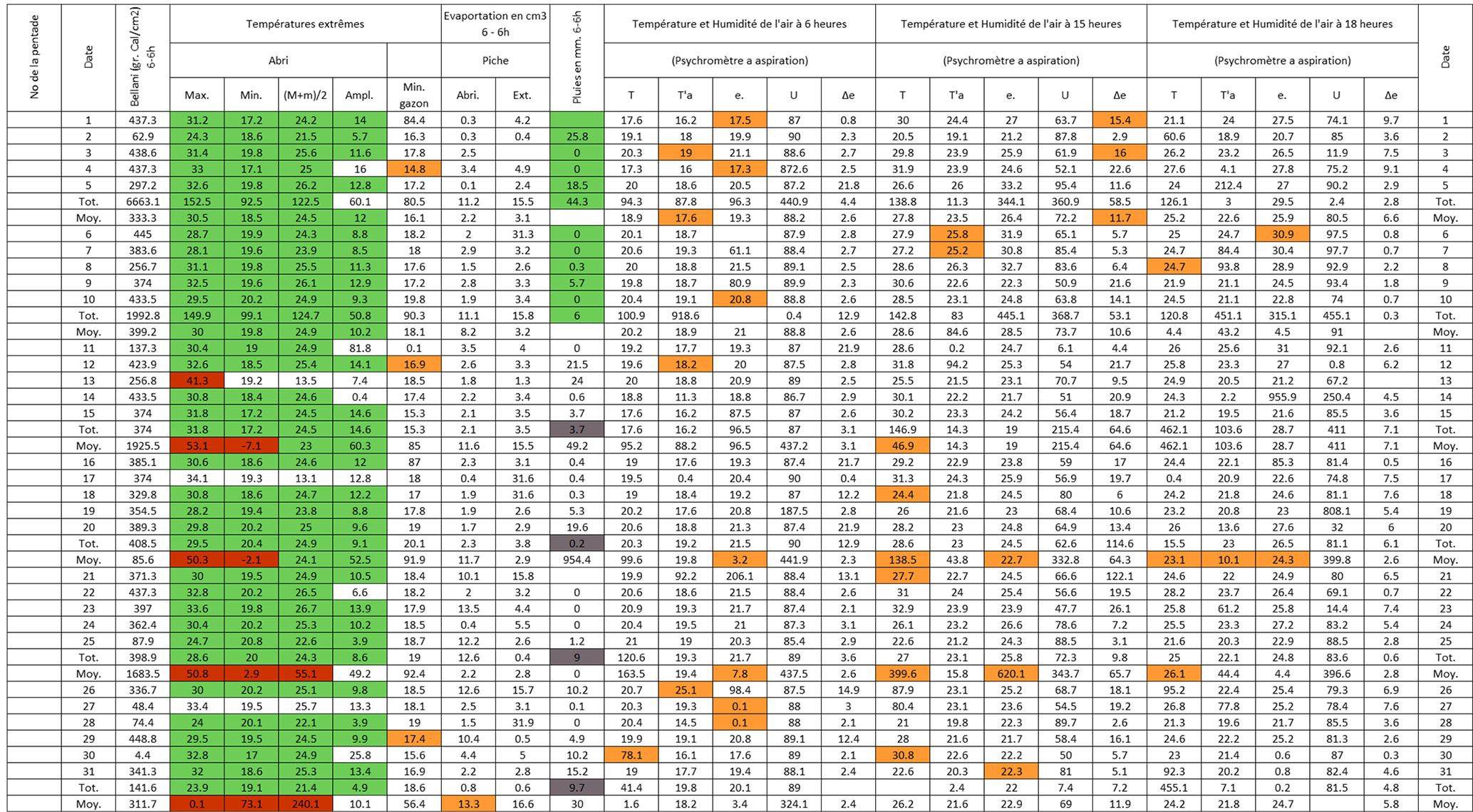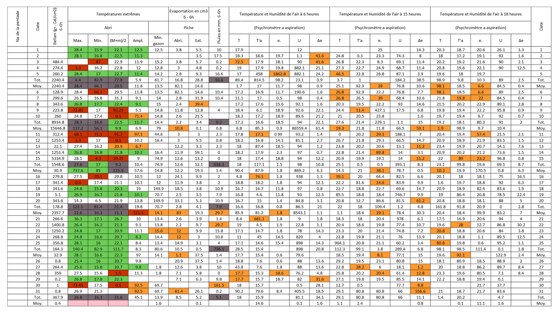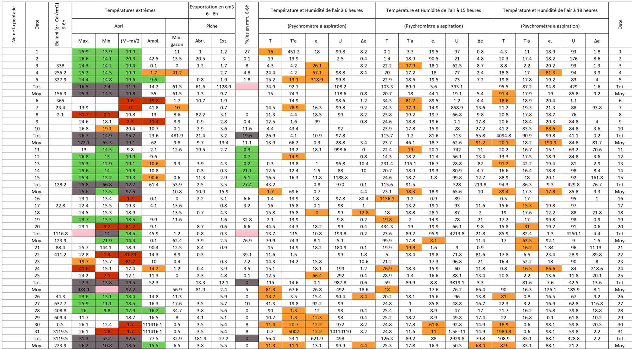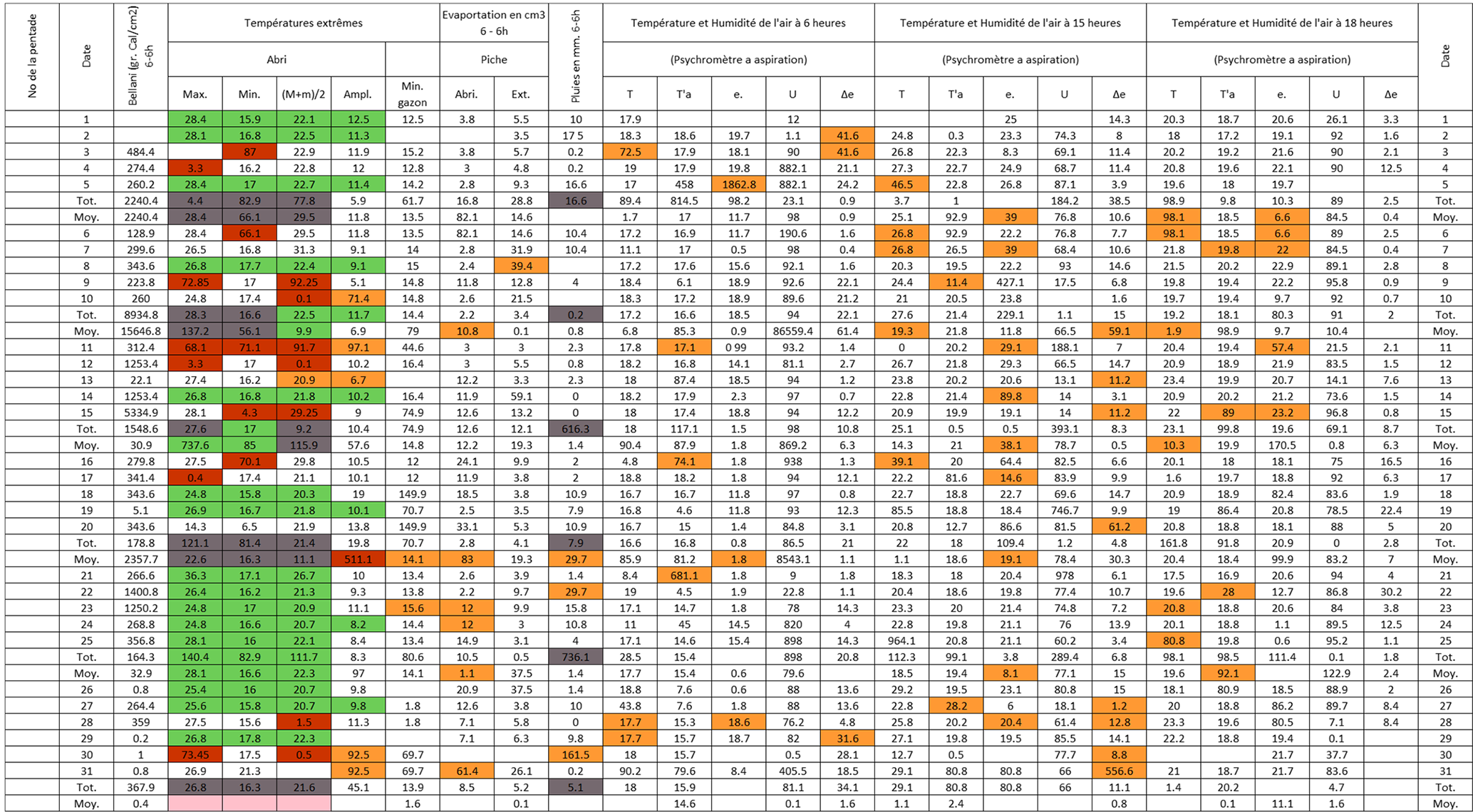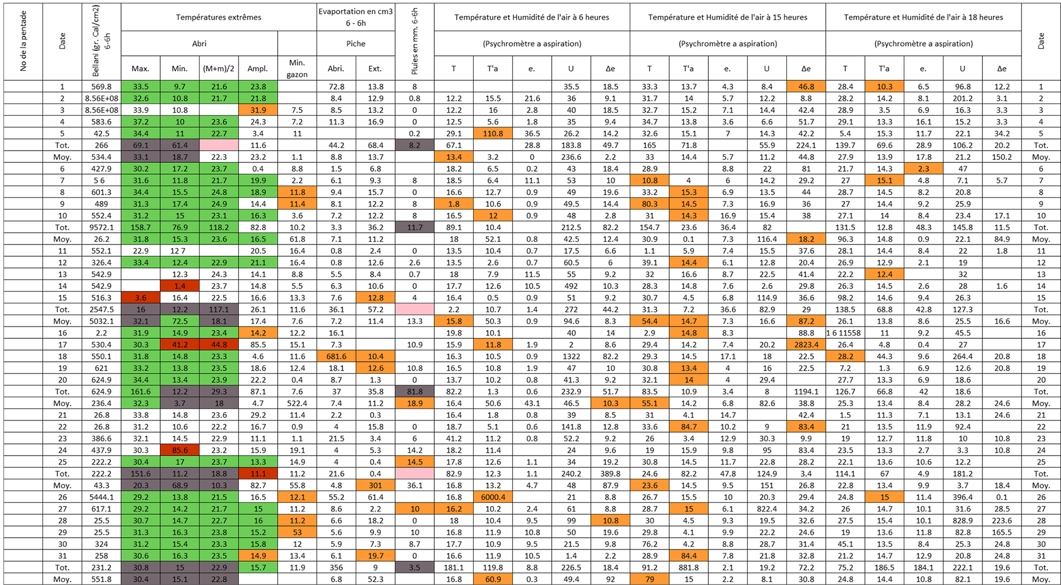 Figure B3Post-quality controlled table using MeteoSaver, showing confirmed values of daily maximum, minimum and average temperature, diurnal temperature range, and daily precipitation (highlighted in green) for the Station Kisanga-Plateau in October 1972 (Fig. A3). The description of the colors in the post-quality controlled table is given in Fig. 10.