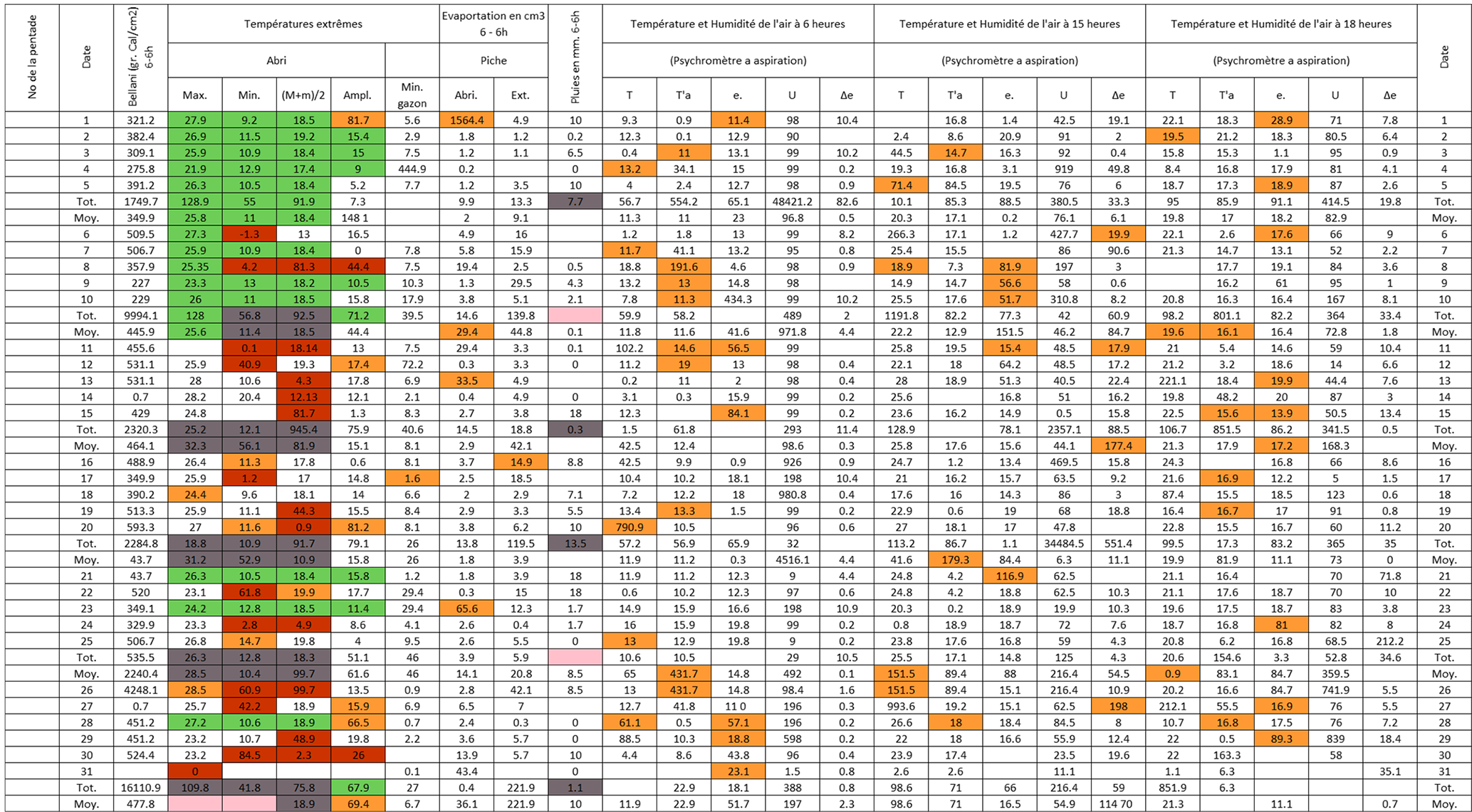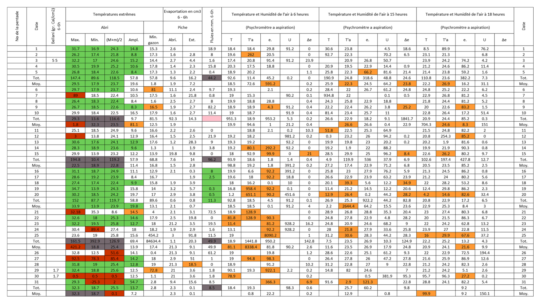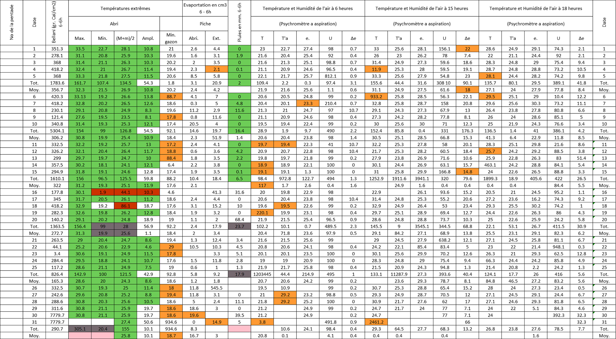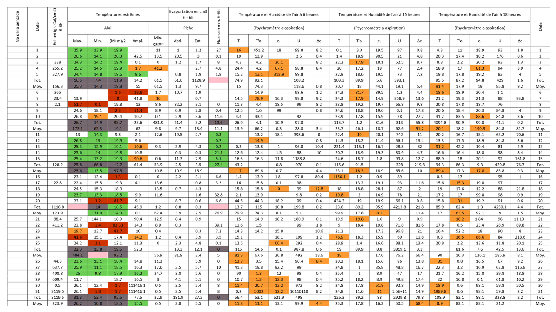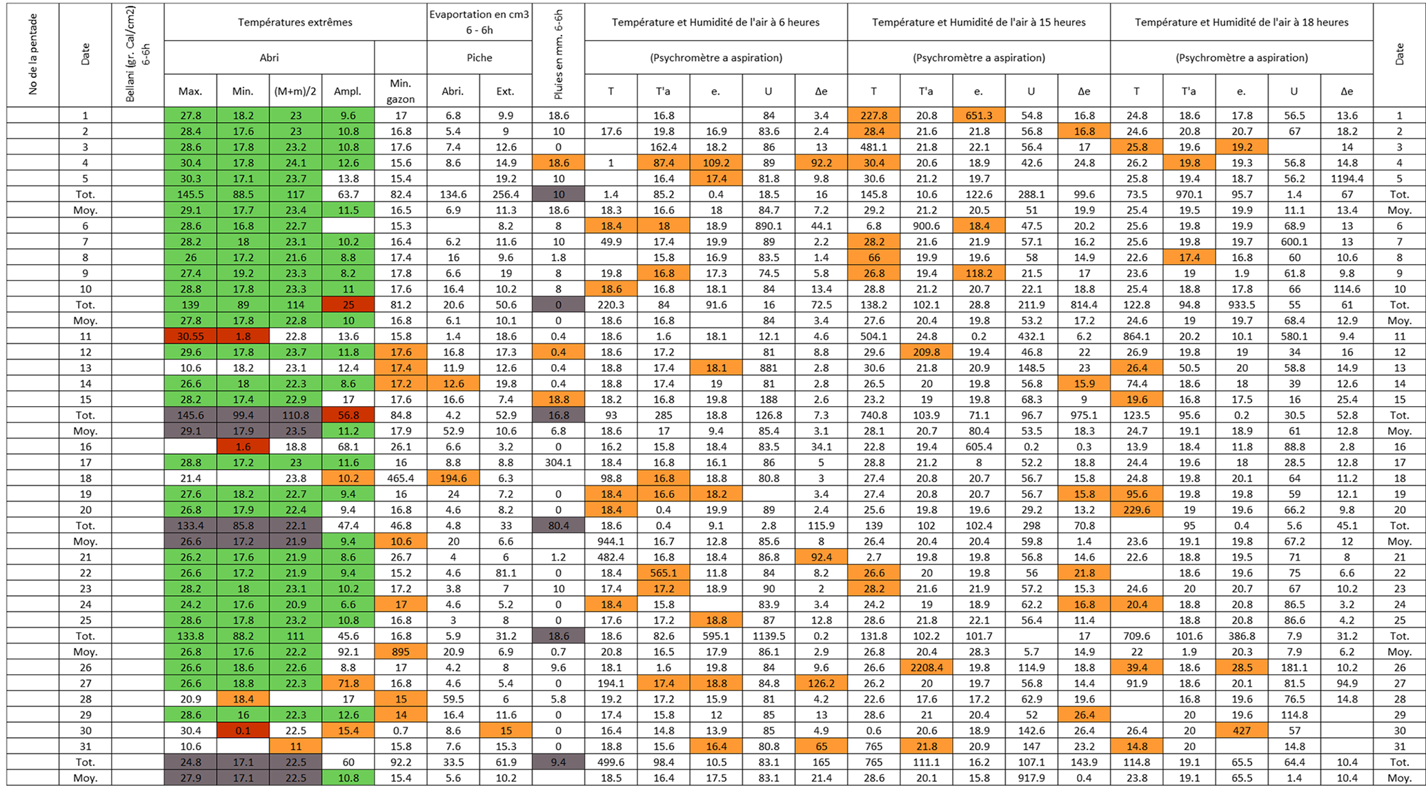 Figure B3Post-quality controlled table using MeteoSaver, showing confirmed values of daily maximum, minimum and average temperature, diurnal temperature range, and daily precipitation (highlighted in green) for the Station Kisanga-Plateau in October 1972 (Fig. A3). The description of the colors in the post-quality controlled table is given in Fig. 10.