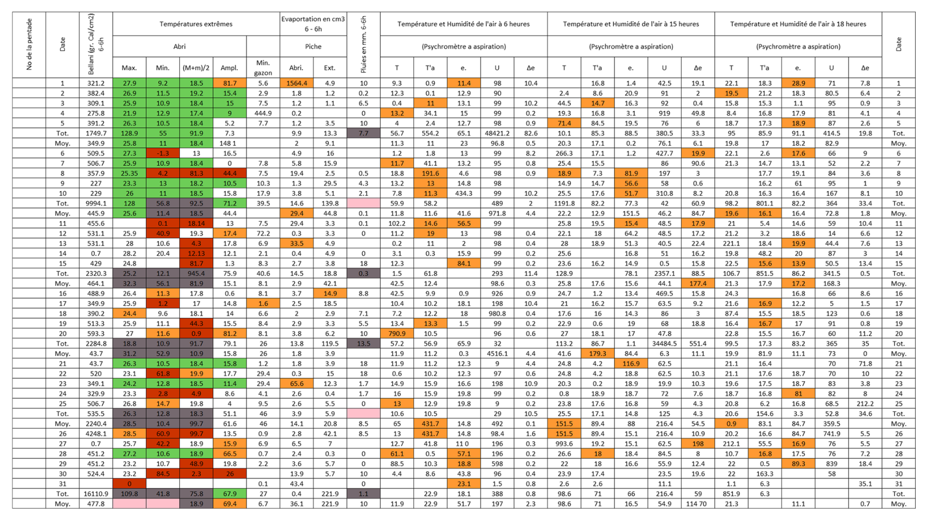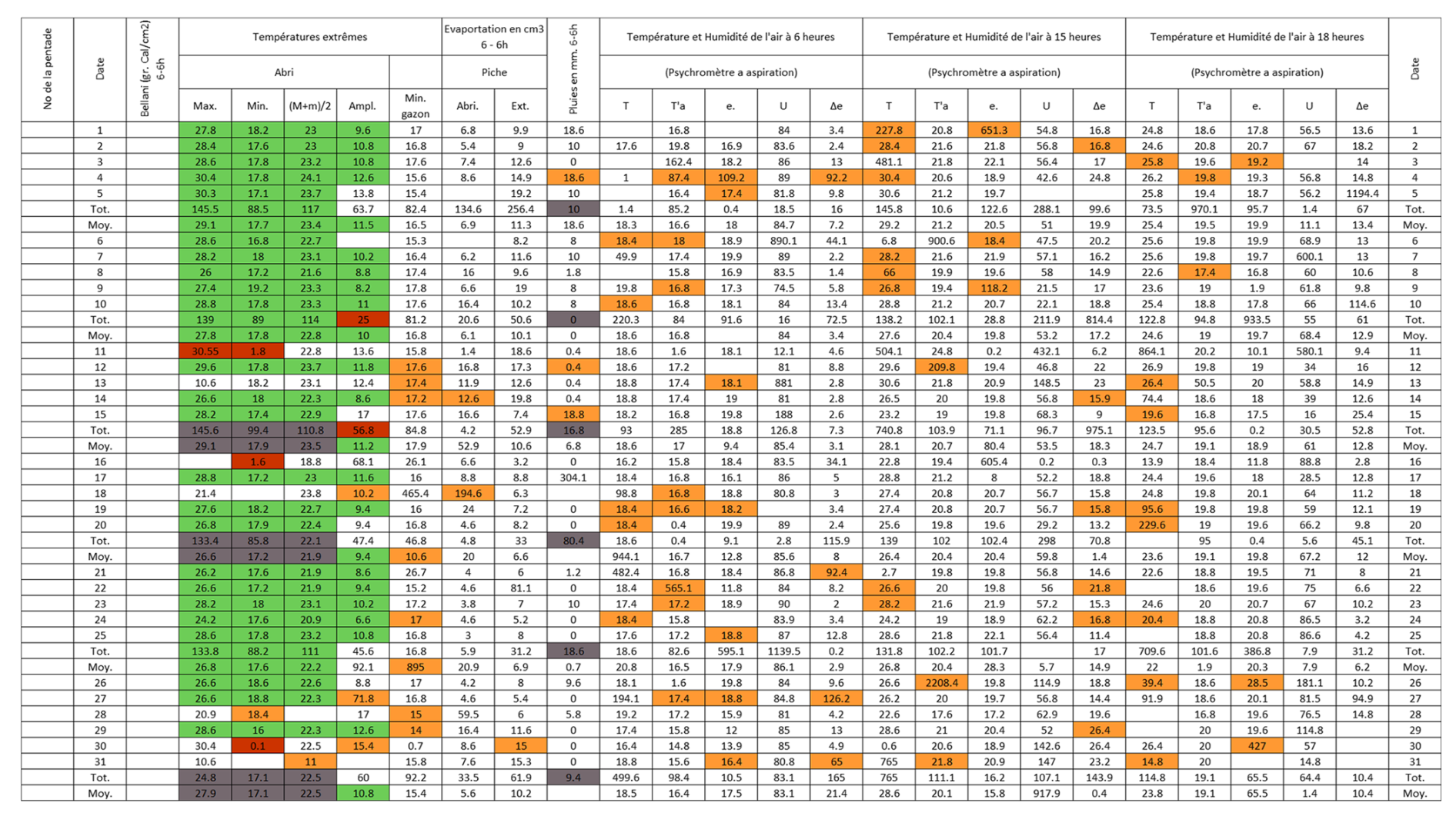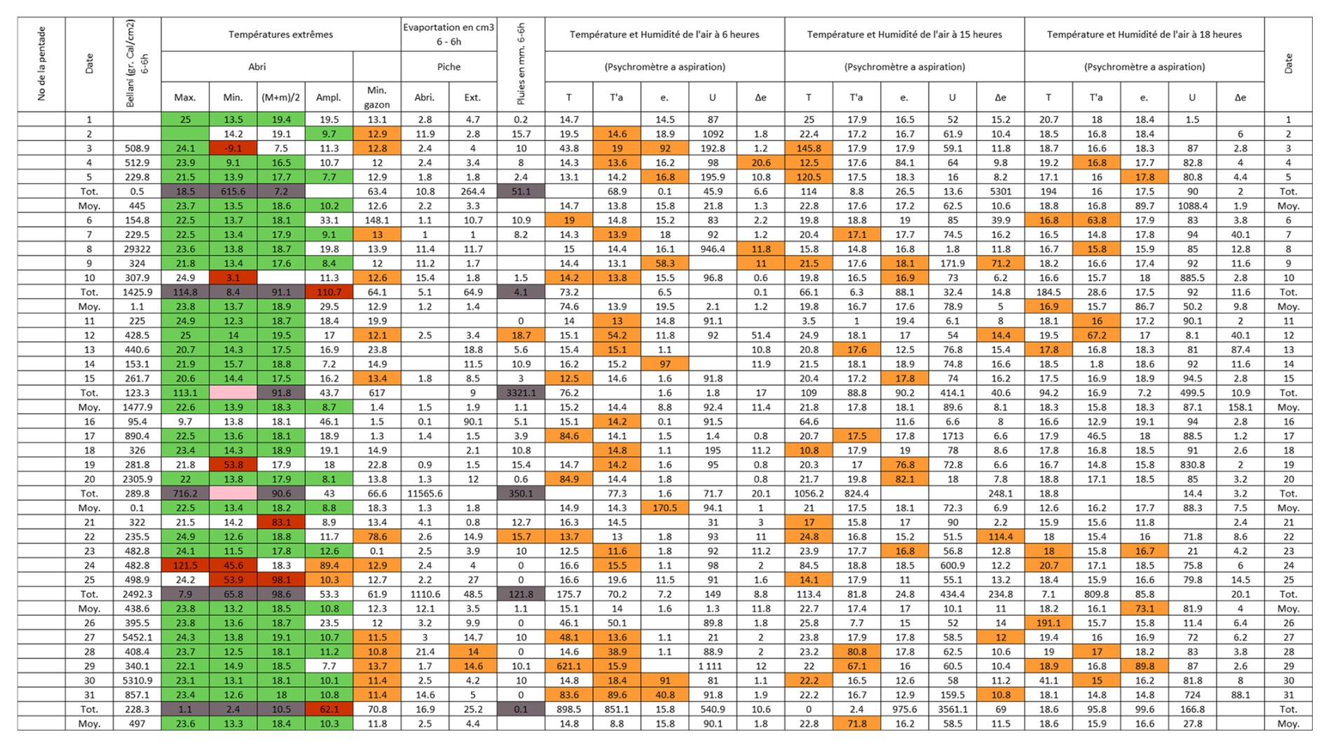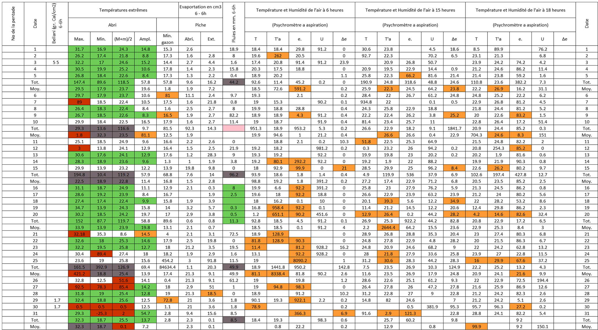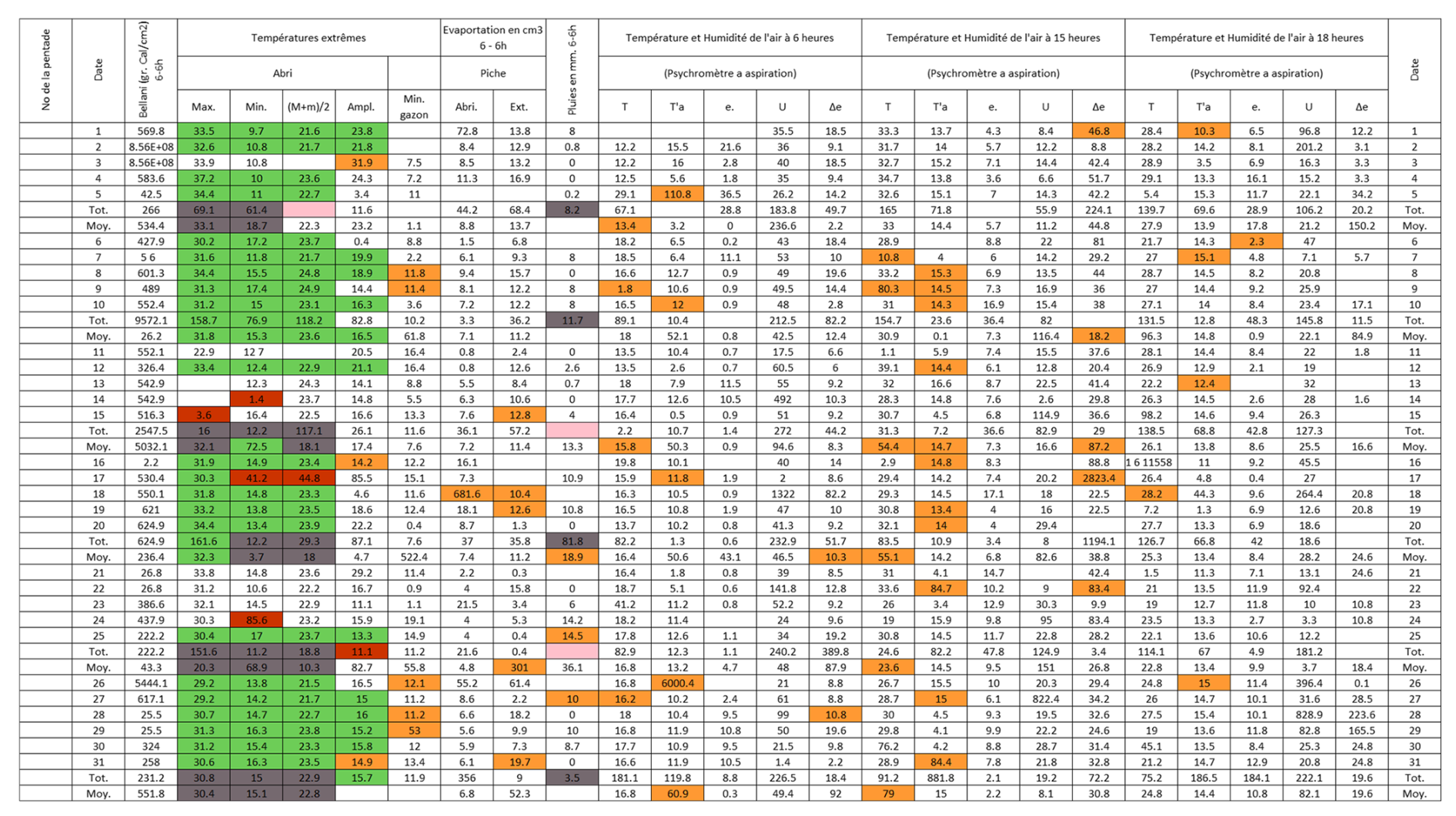 Figure B3Post-quality controlled table using MeteoSaver, showing confirmed values of daily maximum, minimum and average temperature, diurnal temperature range, and daily precipitation (highlighted in green) for the Station Kisanga-Plateau in October 1972 (Fig. A3). The description of the colors in the post-quality controlled table is given in Fig. 10.