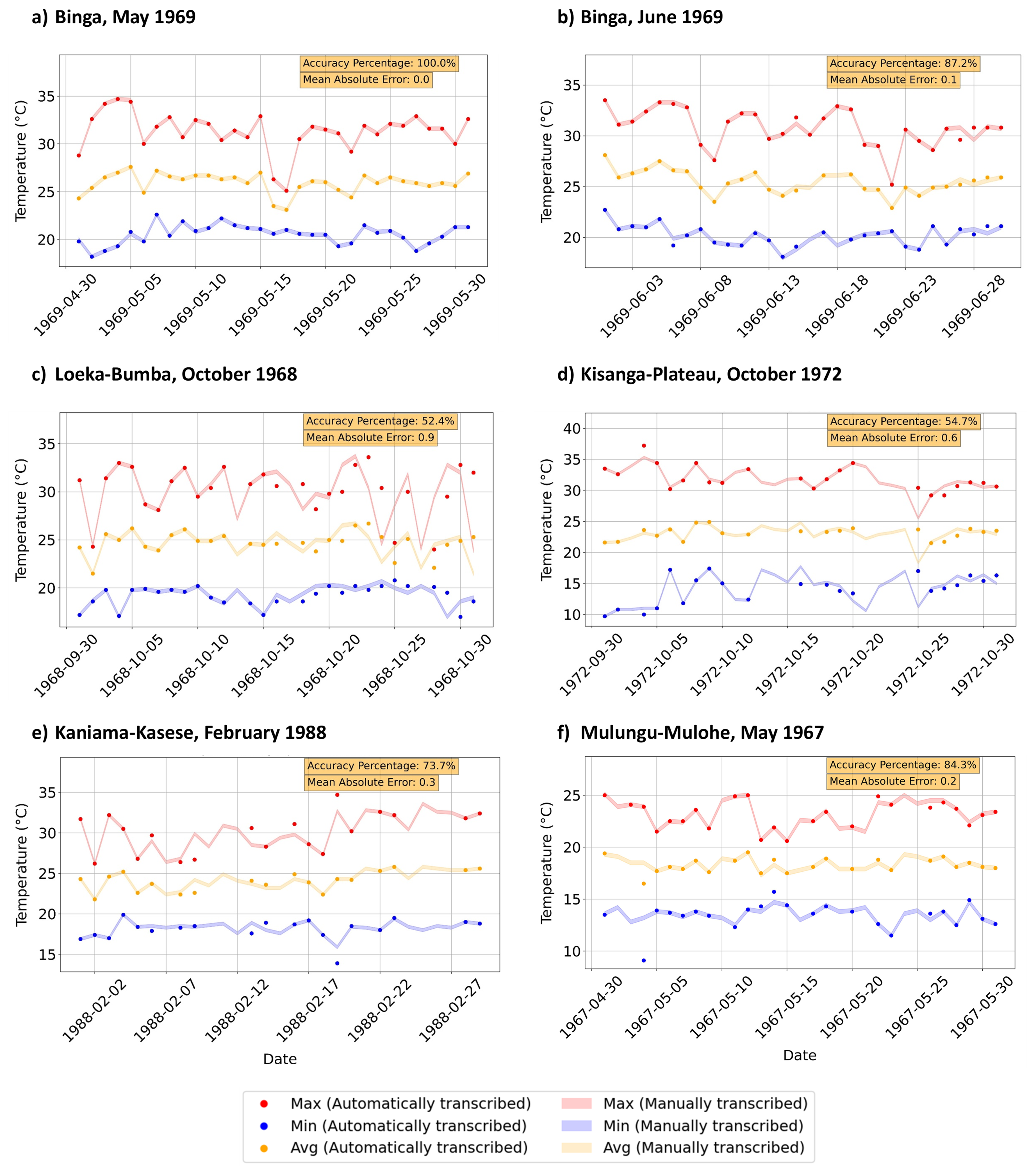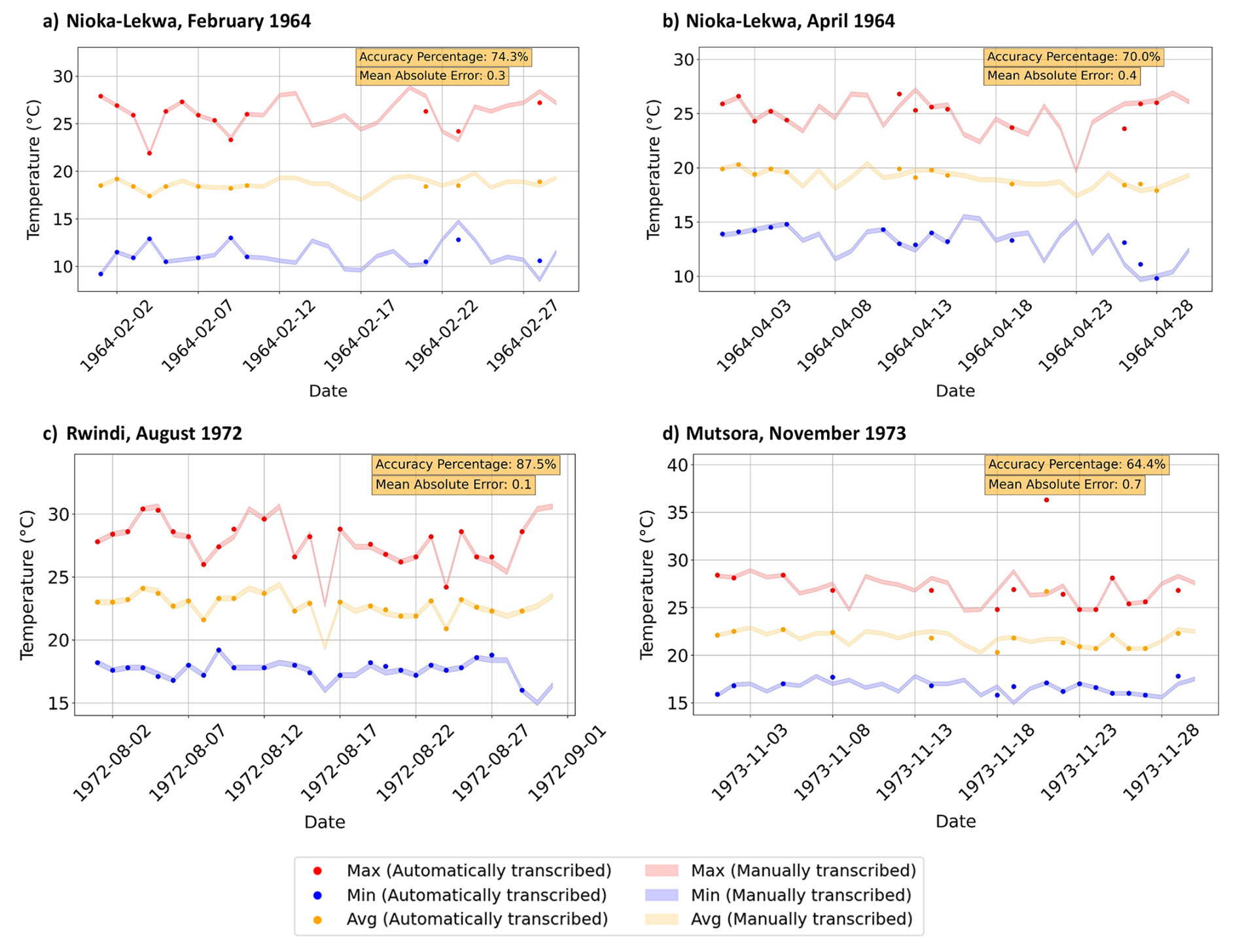 Figure 13Time series plot of the daily maximum (red), average (orange), and minimum (blue) temperatures for the respective stations. Each variable shows automatically transcribed values as solid markers, while manually transcribed values are displayed as lighter time series bands with a 0.2 °C uncertainty margin applied during QA/QC checks. The accuracy percentage and mean absolute error (MAE) between the automatically and manually transcribed values are noted in the upper right corner of the plot. The accuracy percentage denotes the percentage of confirmed, automatically transcribed values that fall within 0.2 °C of the manually transcribed value. Together, these metrics quantify the agreement between the automatically transcribed values using MeteoSaver v1.0 (markers) and their corresponding manually transcribed values (bands), providing an indication of the reliability of the automatically transcribed observations (with respect to manual transcriptions) for subsequent climatological analyses. The analysis assumes that the manually transcribed values are correct; however, this may not always be the case, as manual transcription is also subject to errors depending on the methods applied.