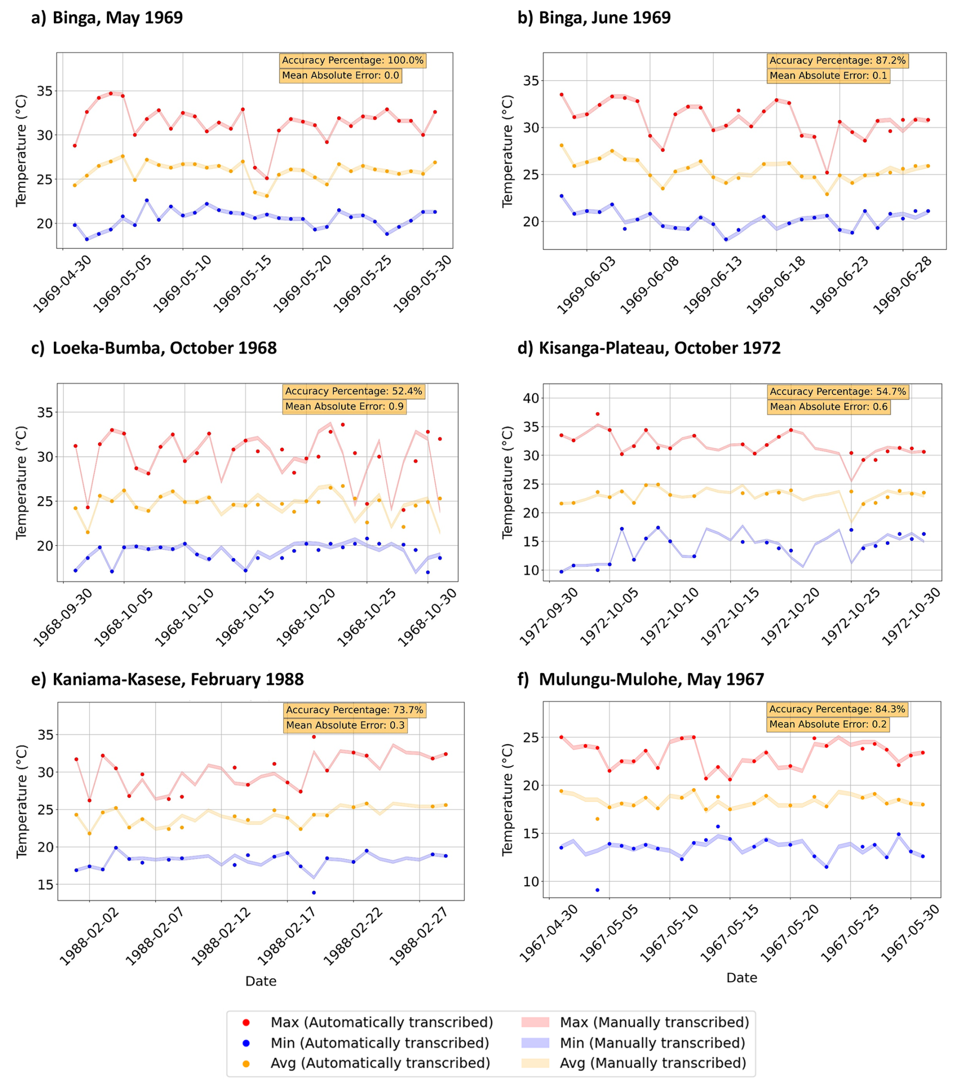 Where: The transcribed values are the daily maximum, minimum, and average temperatures. Accuracy takes into consideration an uncertainty margin of 0.2 °C for transcribed and calculated (confirmed) temperature values.