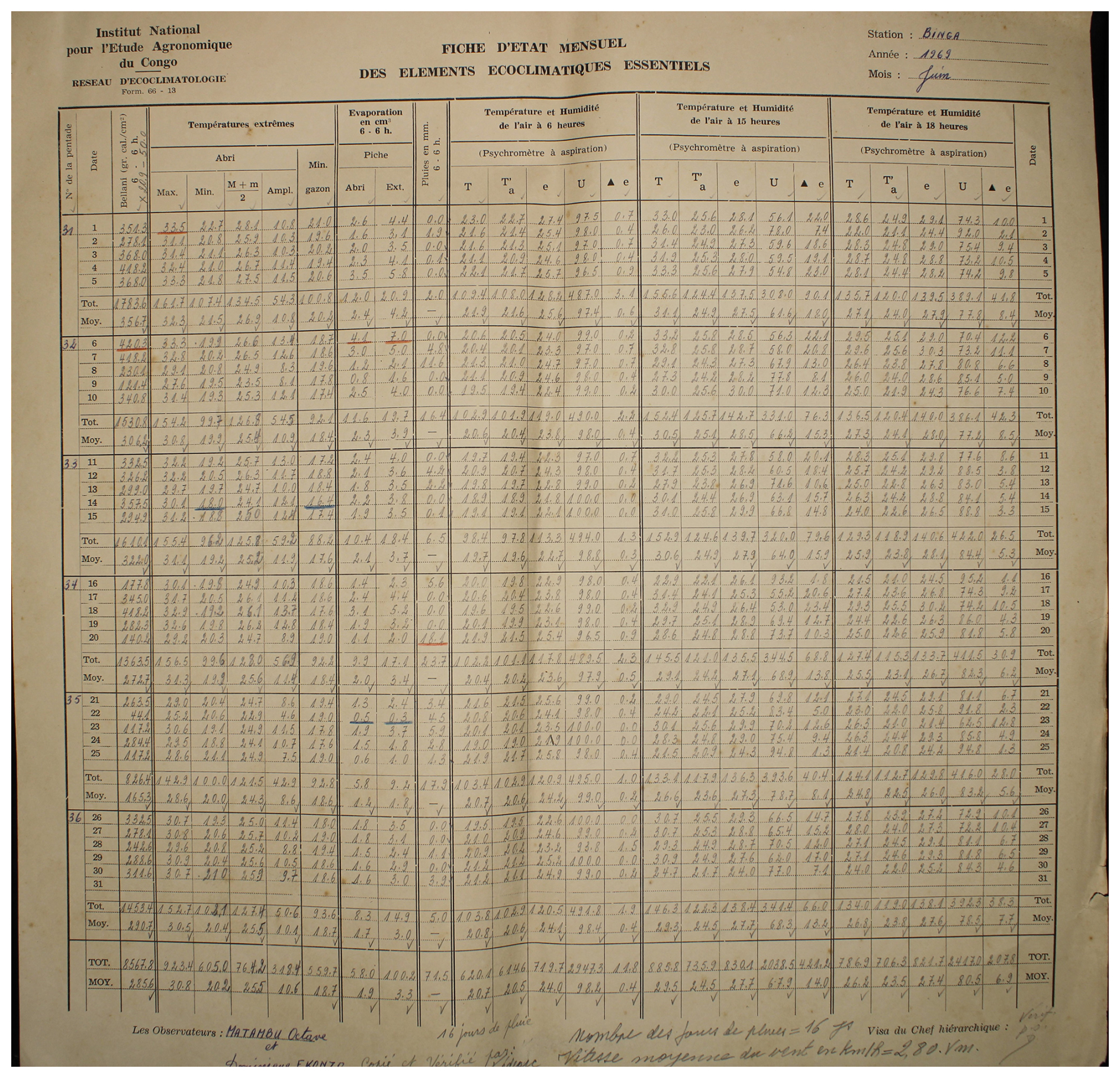 Figure A1Observed weather data sheet for June 1969 at Station Binga (2°18′ N, 20°30′ E) in DRC available within the archives of INERA, Yangambi. Refer to Fig. 1 for the table structure information.