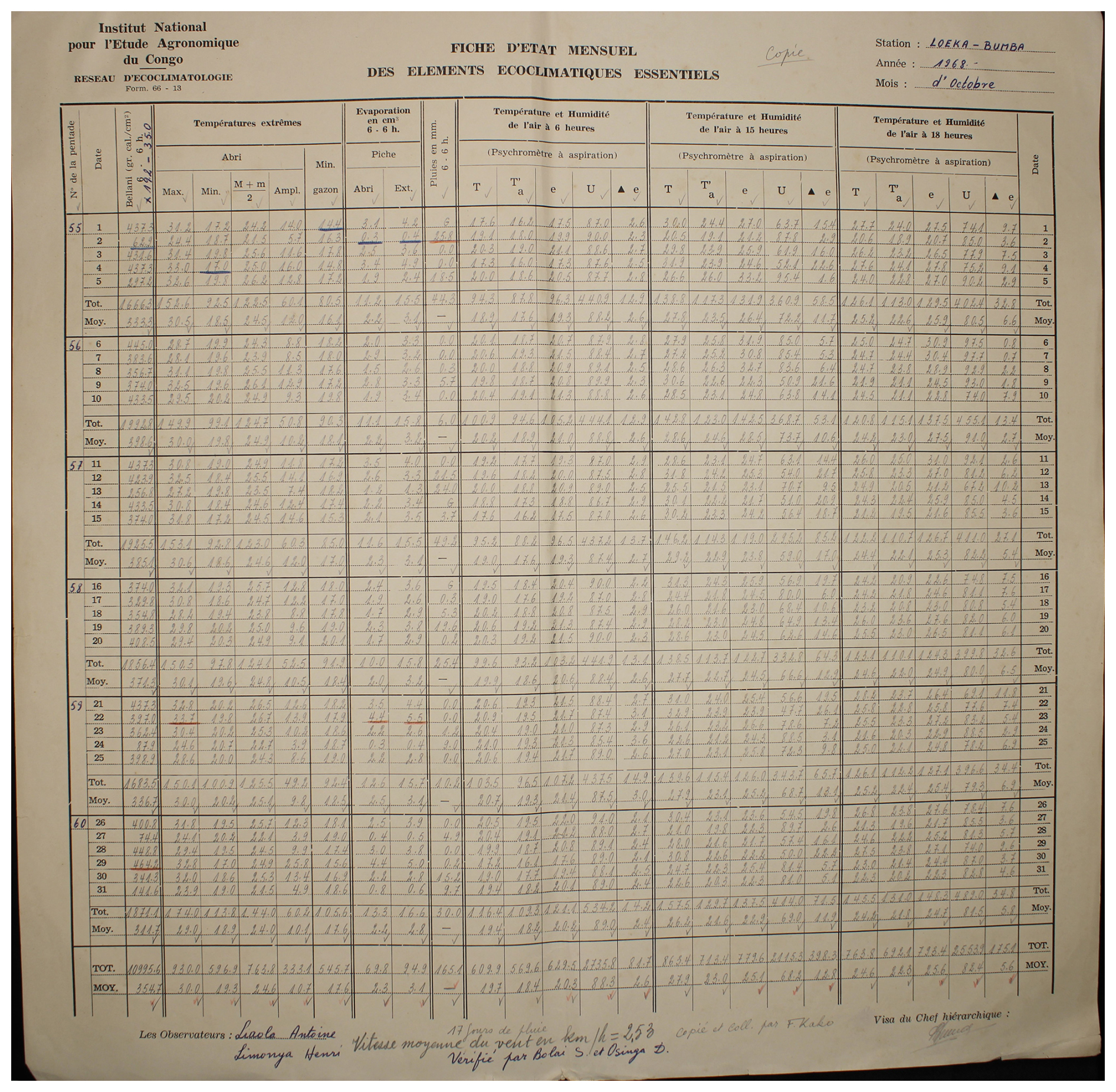 Figure A2Observed weather data sheet for October 1968 at Station Loeka-Bumba (2°15′ N, 22°49′ E) in DRC available within the archives of INERA, Yangambi. Refer to Fig. 1 for the table structure information.