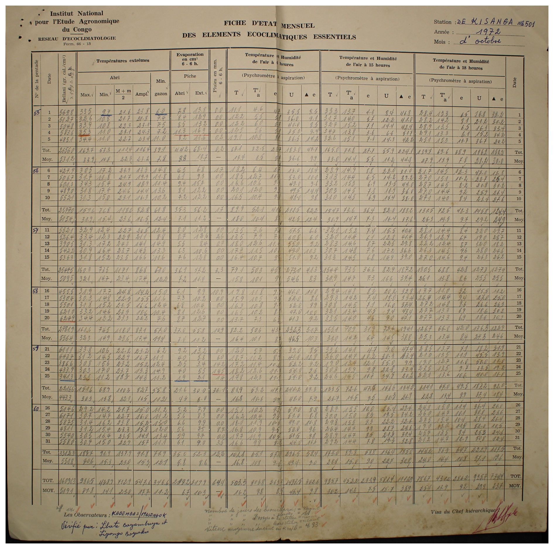Figure A3Observed weather data sheet for October 1972 at Station Kisanga-Plateau (11°44′ S, 27°25′ E) in DRC available within the archives of INERA, Yangambi. Refer to Fig. 1 for the table structure information.