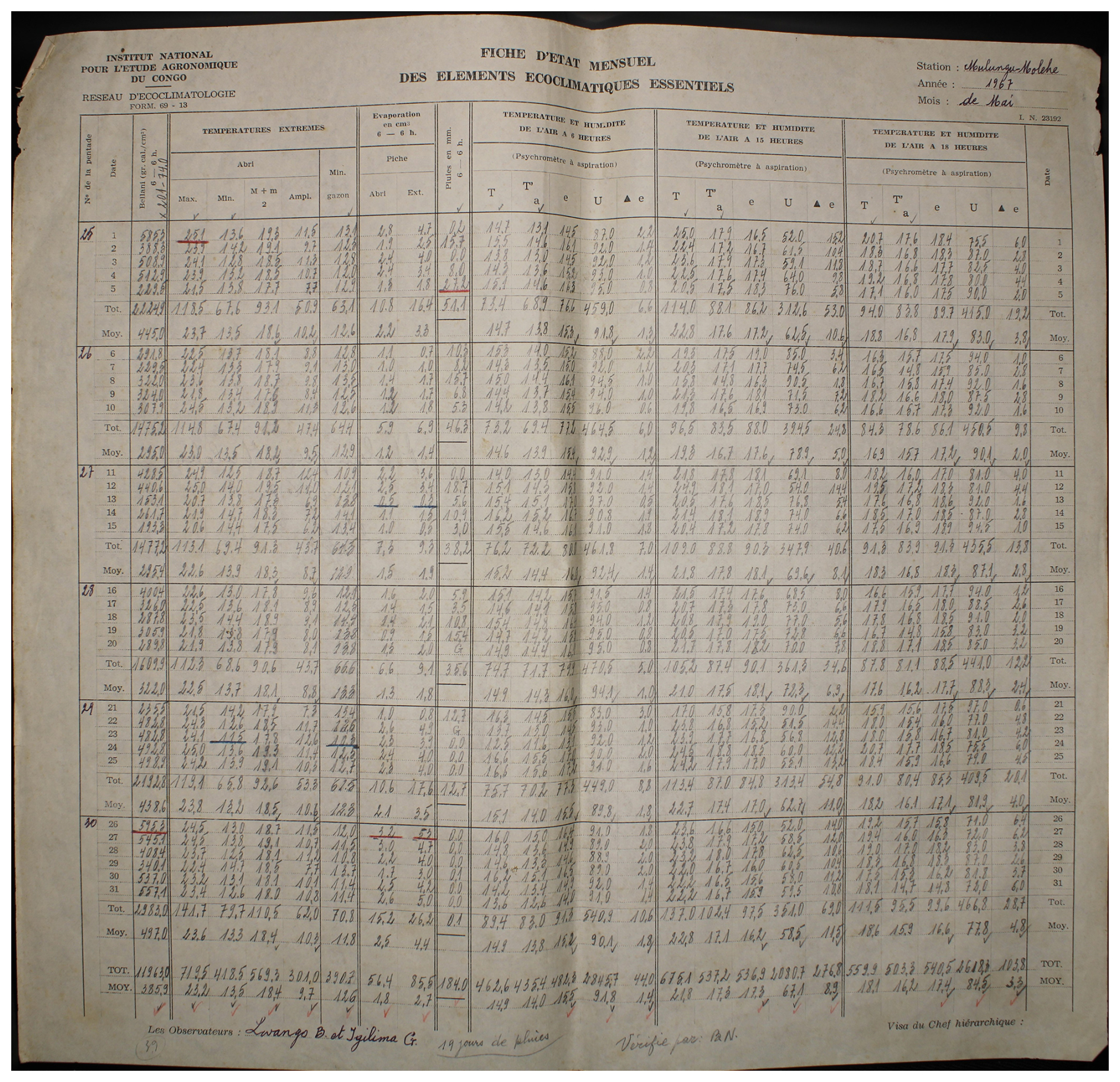 Figure A5Observed weather data sheet for May 1967 at Station Mulungu-Mulohe (2°18′ S, 28°47′ E) in DRC available within the archives of INERA, Yangambi. Refer to Fig. 1 for the table structure information.