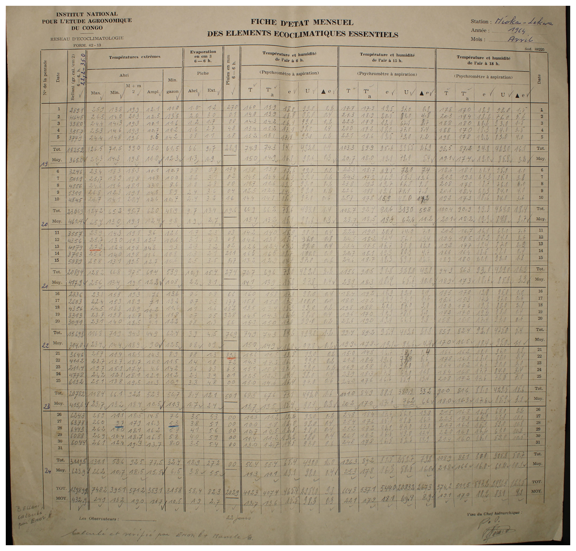 Figure A7Observed weather data sheet for April 1964 at Station Nioka-Lekwa (2°07′ N, 30°38′ E) in DRC available within the archives of INERA, Yangambi. Refer to Fig. 1 for the table structure information.
