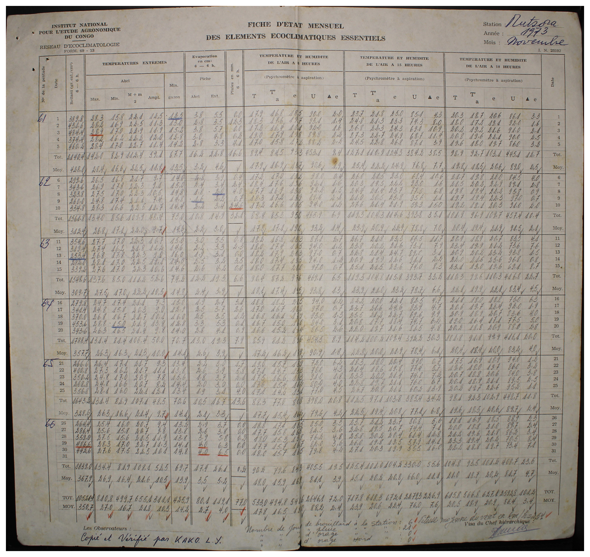 Figure A9Observed weather data sheet for November 1973 at Station Mutsora (0°19′ N, 29°44′ E) in DRC available within the archives of INERA, Yangambi. Refer to Fig. 1 for the table structure information.