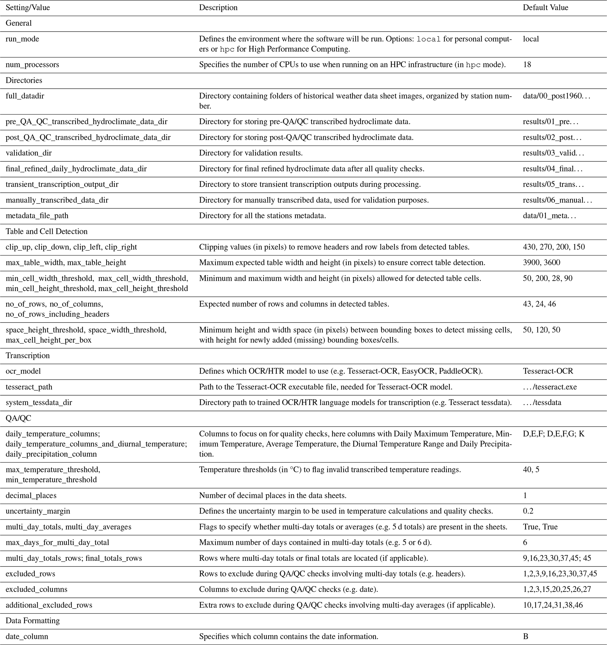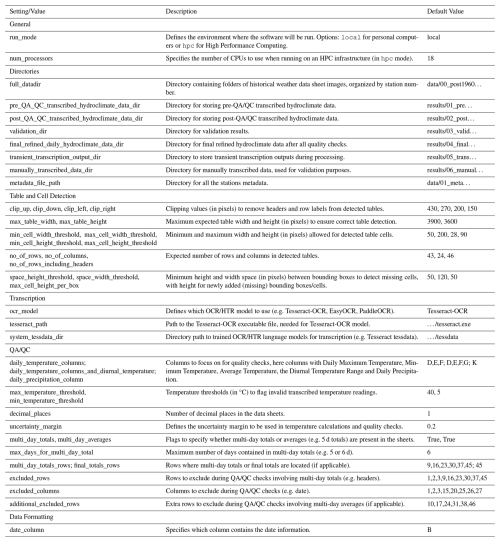 The second step requires specifying the directories for both input and output files, as outlined in Directories in Table 1. For inputs, this includes the folders containing digitized (scanned) historical weather data sheets. For outputs, the locations for the following must be defined: (i) pre-quality assessment and quality control (QA/QC) transcribed data, (ii) post-QA/QC transcribed data, (iii) final refined data, (iv) transient transcription outputs, and (v) manually transcribed data.
