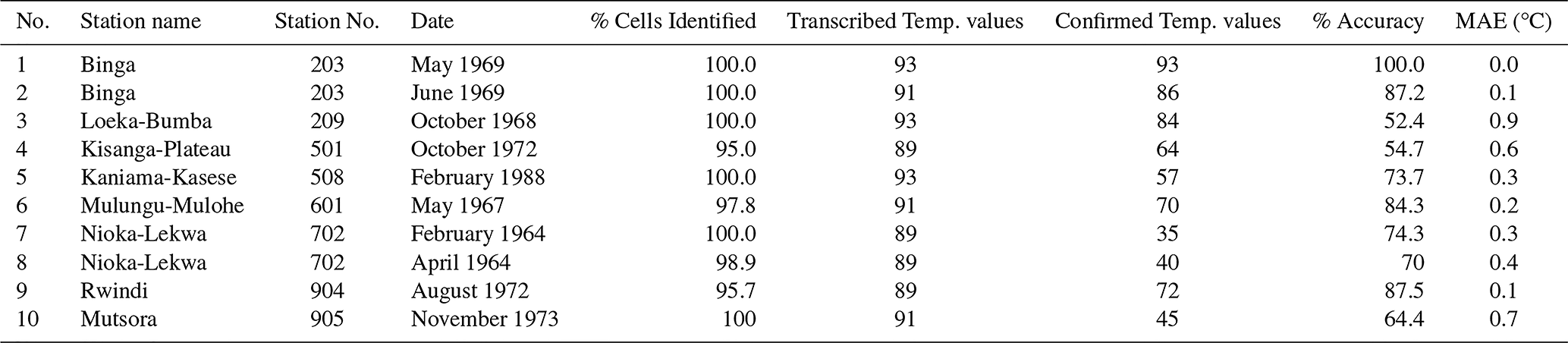 The results indicate that between 95 %–100 % of the handwritten temperature records (daily maximum, minimum, and average temperatures) from the 10 sheets were successfully detected using the Table and Cell Detection module, with a median of 100 % of cells identified across the sheets. These detected cells were then automatically transcribed by our software. Of these transcribed values, a median of 74.4 % across the sheets achieved the highest quality flag and were therefore confirmed by the QA/QC. This means that 25.6 % of the transcribed values were excluded from the final output timeseries because they could not be confirmed by the QA/QC. The confirmed temperature values showed a median match rate of 74 % with manually transcribed records (see Table 2). Here, accuracy is defined as the proportion of automatically transcribed and QA/QC confirmed values that match manually transcribed values, considering a set uncertainty margin of 0.2 °C. Additionally, we calculate the mean absolute error (MAE) of these automatically transcribed temperature values compared to the manually transcribed ones. The MAE across these transcribed sheets ranged from 0.0–0.9 °C, with a median of 0.3 °C (see Table 2).