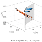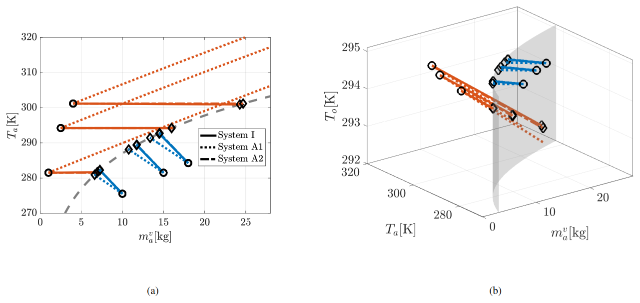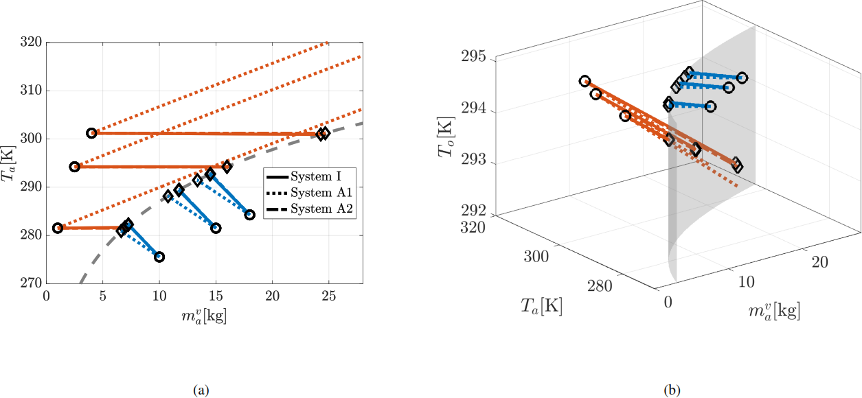 Figure 3Trajectories in the evaporation (orange) and condensation (blue) regimes predicted by the three models – System I (solid), A1 (dotted), and A2 (dash-dotted) – for realistic values of Ta, To and . (a) Projection onto the Ta– plane. (b) Full three-dimensional trajectories in space. The grey dashed curve (left) and the transparent surface (right) denote the steady-state (neutral) surface. Initial conditions are shown as black circles, and equilibrium points (when reached) as black diamonds.