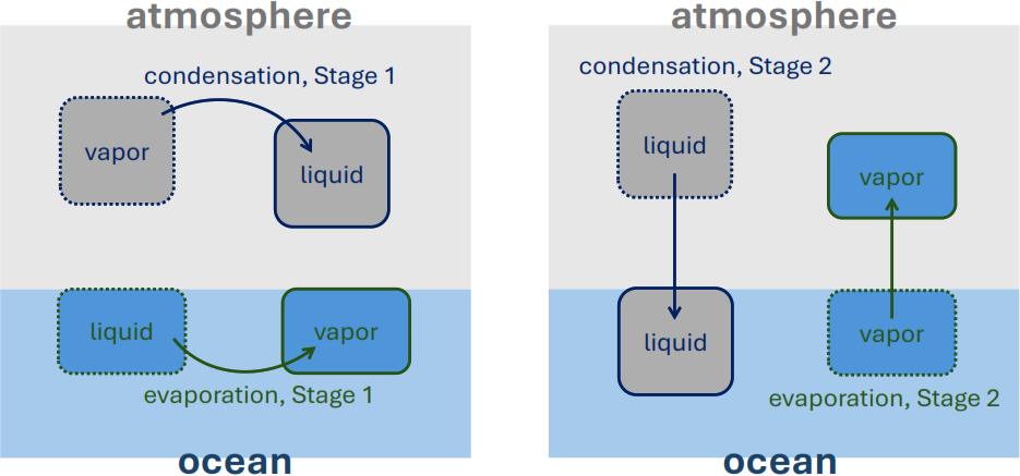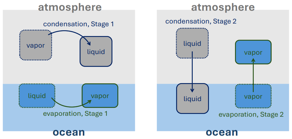 Similarly, evaporation is also conceptualized as a two-stage process, illustrated by the blue regions in Fig. 1. When water evaporates from the ocean, it first becomes water vapor within the ocean before subsequently ascending into the atmosphere.