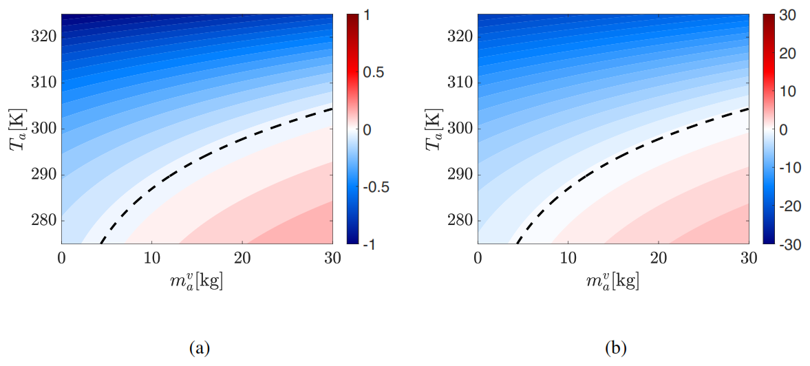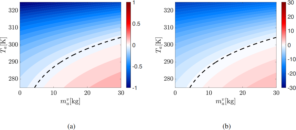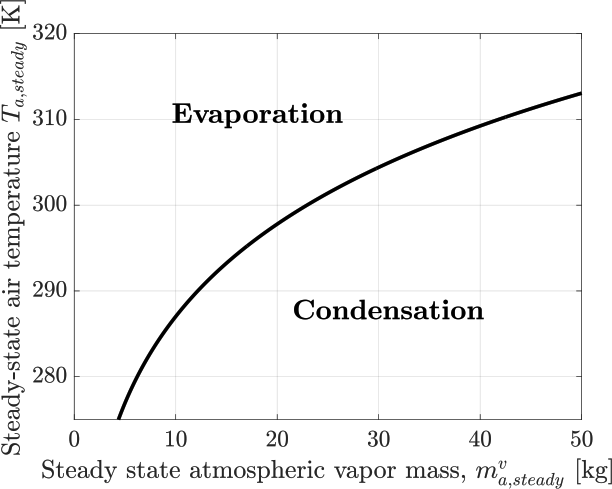 Figure 2 shows how the steady-state air temperature Ta,steady varies with the atmospheric vapor mass for a representative set of physical parameters. As expected from the logarithmic form of Eq. (55), the rate of increase of Ta,steady diminishes with increasing . The region above the neutral curve in the figure corresponds to finite evaporation of oceanic liquid into atmospheric vapor, while the region below indicates condensation.