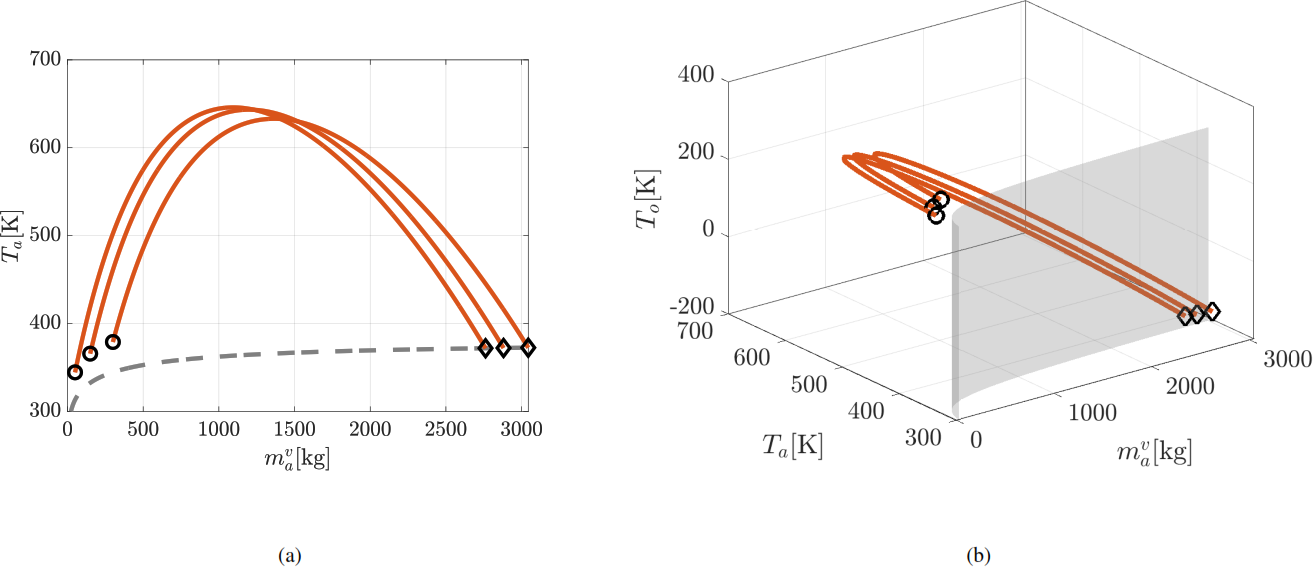 Figure 3 shows the evolution of six trajectories for each of the Systems I, A1, and A2, projected onto the Ta– plane (left panel) and in the three-dimensional space To–Ta– (right panel). In the condensation regime (i.e., , below the neutral curve in the left panel), the blue trajectories illustrate that, starting from the initial conditions (black circles), the atmospheric vapor mass decreases in all three models up to their equilibrium values (black diamonds). Conversely, in the evaporation regime (orange trajectories), the vapor mass increases.