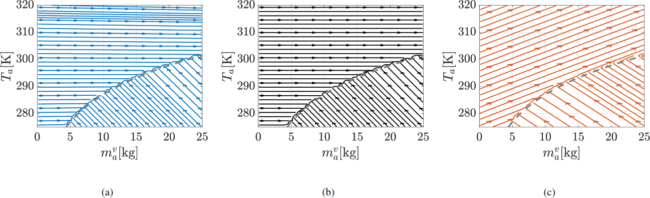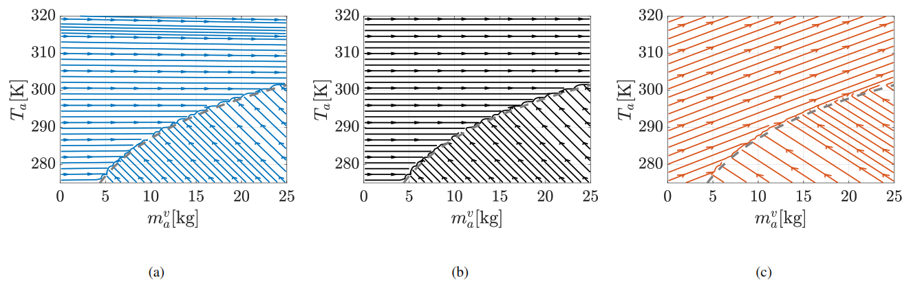 Figure 5Phase plots in plane of System (a) I, (b) A2, and (c) A1 at T= 295 K. Uneven streamline spacing is an artifact of MATLAB's streamslice function.