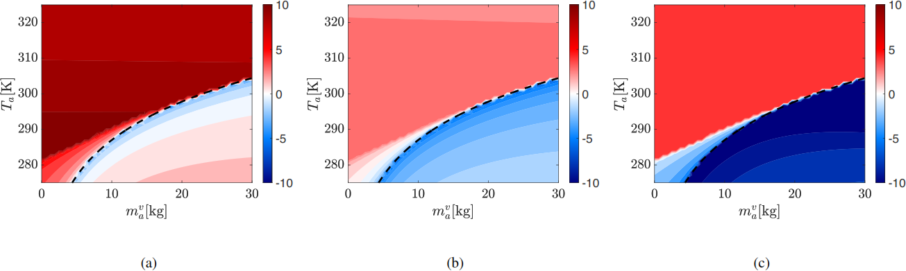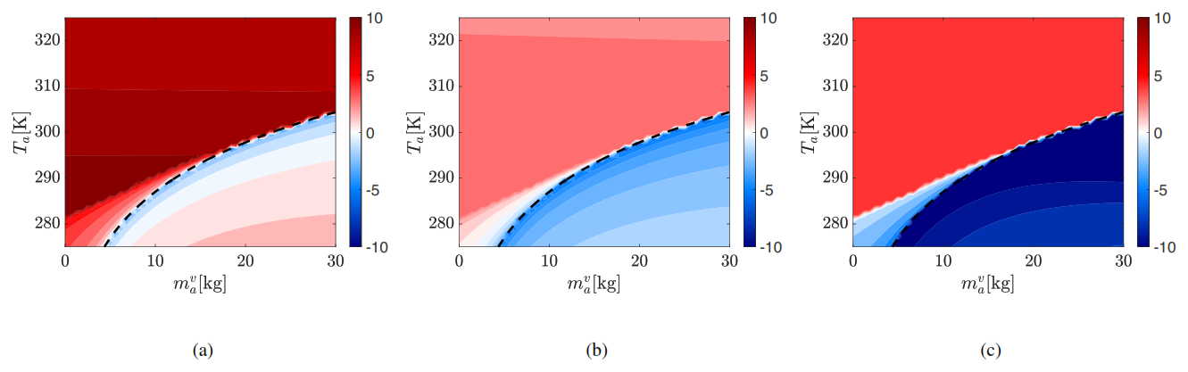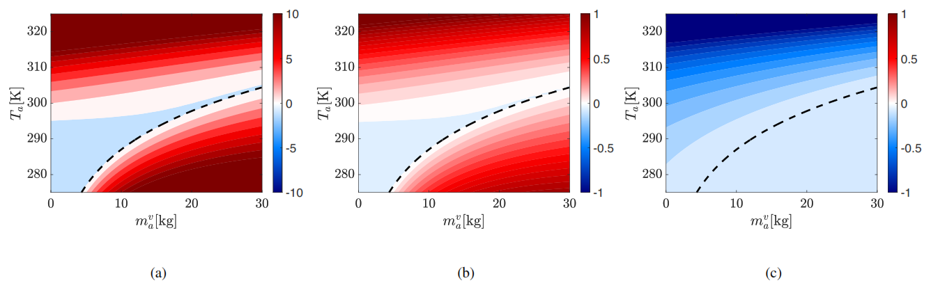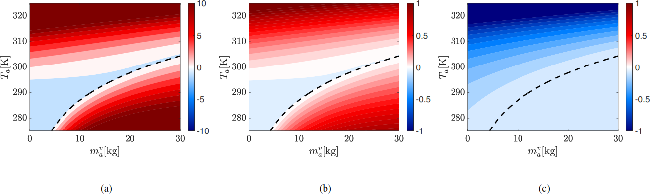 Although System A1 conserves energy, its equilibrium errors mirror those in A2 but with significantly larger magnitudes. Figure 7 shows the logarithm of the absolute percentage errors in the equilibrium , Ta, and To, computed for the same set of initial conditions used to visualize System A2's error in Fig. 6. In the condensation regime, errors are small (negative log contours). In contrast, the evaporation regime exhibits extreme errors: where the log of percentage error magnitude reaches 1 for Ta, 5 for To and 10 for . These substantial discrepancies reflect the destabilizing effect of A1's IEFLX evaporation term.