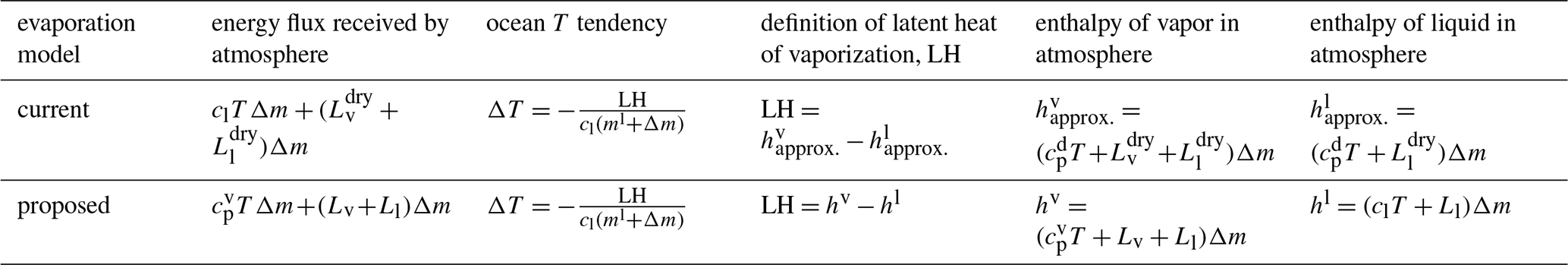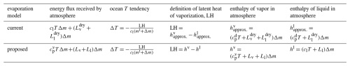 In both the current (Eq. 3) and the proposed (Eq. 6) models, the ocean temperature tendency is proportional to the latent heat of vaporization, defined as the difference in enthalpy between vapor and liquid forms of same mass Δm. However, in the current model, these enthalpies are defined using dry-air heat capacity (), while the proposed model uses species-appropriate heat capacities. These conceptual differences are summarized in Table 1. We observe from comparing the current and the proposed design that during evaporation, in the current model, the atmosphere receives and the ocean loses more energy than in the proposed model. Later in Sect. 4 we will show that condensation triggers an opposite behavior in the energy deficit/excess in the current model. However, the magnitude of errors (measured as differences between the current model and the model with unapproximated thermodynamics) during condensation are smaller than those during evaporation.