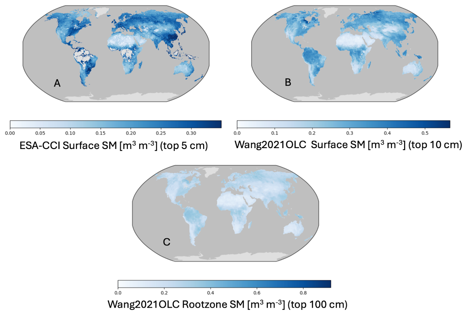 Figure 1Long-term mean soil moisture (SM) from observational datasets. (A) ESA-CCI Surface SM [m3 m−3] (top 5 cm) (1978–2023), providing global estimates based on satellite data. (B) Wang et al. (2021) OLC Surface SM [m3 m−3] (top 10 cm) (1970–2016), derived from a merged dataset of satellite and in-situ observations. (C) Wang et al. (2021) OLC Rootzone SM [m3 m−3] (top 100 cm), representing long-term mean soil moisture across the rootzone. Each subplot shows the global distribution of soil moisture at the depths represented in each product.