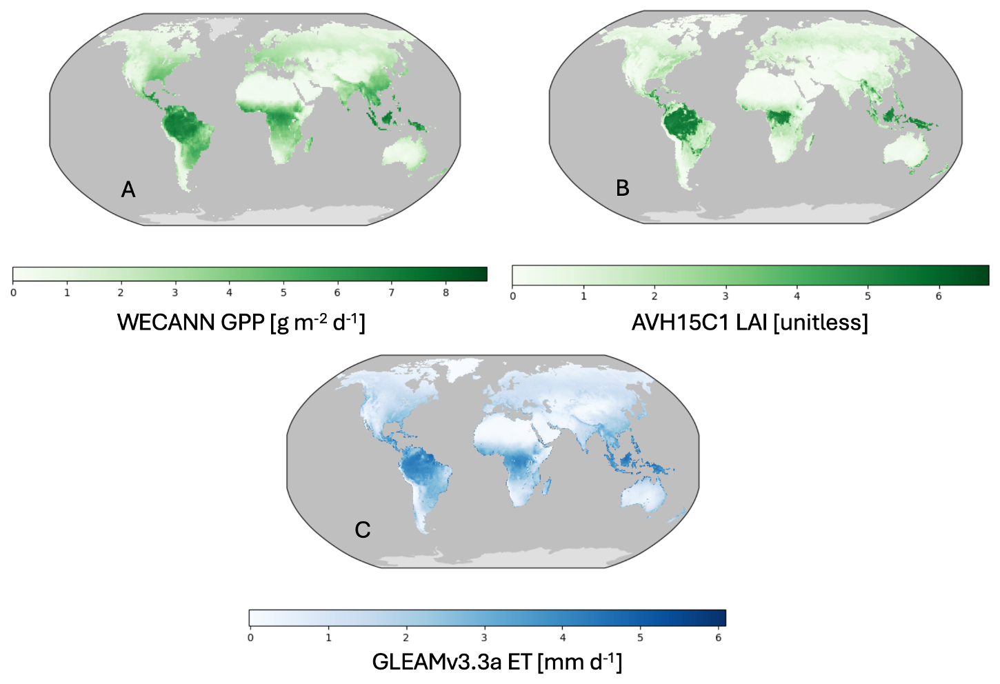 Figure 2Long-term mean ecohydrological variables from observational datasets. (A) WECANN GPP [g m−2 d−1 ] (2007–2016), providing global estimates of gross primary productivity derived from machine learning techniques. (B) AVH15C1 LAI [unitless] (1981–2019), representing global leaf area index values from the NOAA Climate Data Record. (C) GLEAMv3.3a ET [mm d−1] (1980–2018), showing global evapotranspiration estimates derived from satellite observations and meteorological data. Each subplot displays the global distribution of these ecohydrological variables.