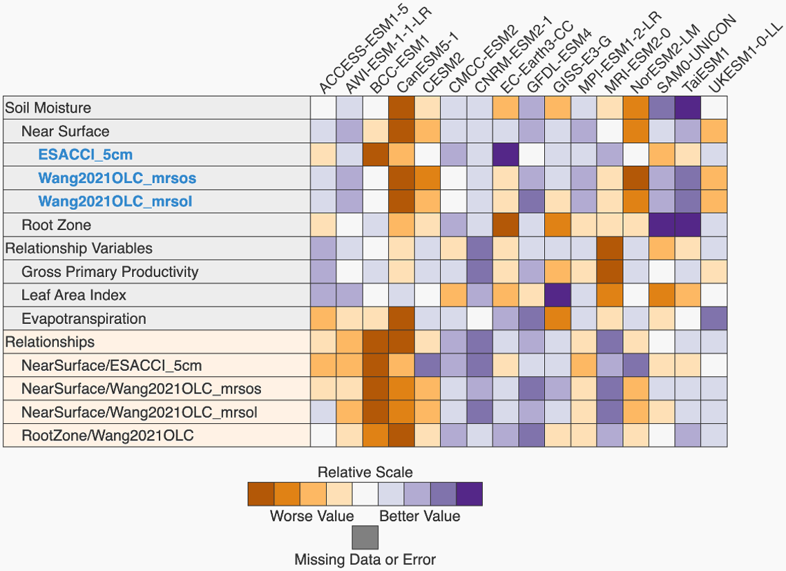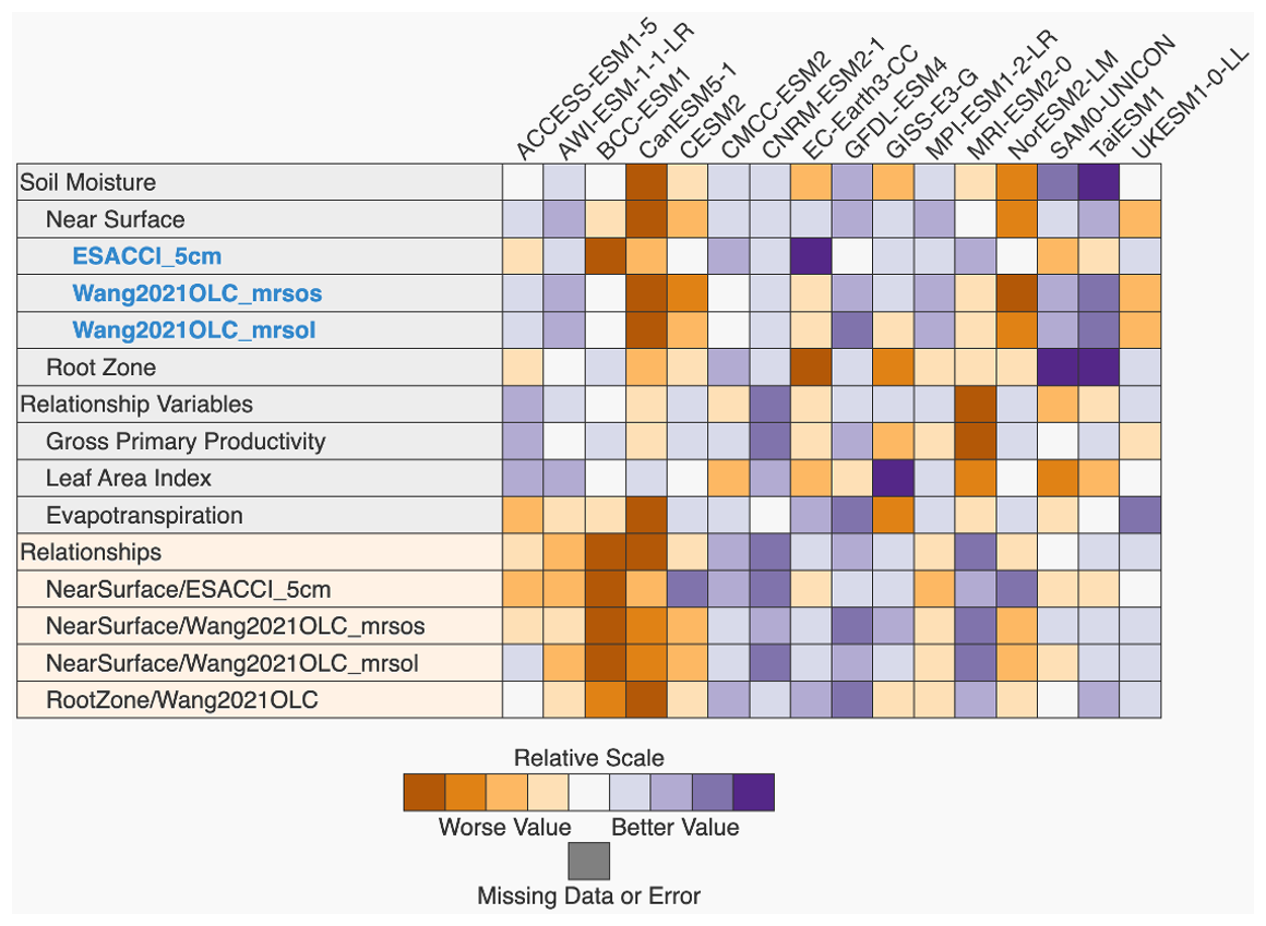 This research was sponsored by the Regional and Global Model Analysis (RGMA) activity of the Earth and Environmental Systems Modeling (EESM) Program in the Earth and Environmental Systems Sciences Division (EESSD) of the Office of Biological and Environmental Research (BER) in the U.S. Department of Energy Office of Science. This work is the result of the RUBISCO project Soil Moisture Working Group effort on benchmarking soil moisture in Earth System Models, supported by the RUBISCO SFA. P.R. acknowledges a grant from the Climate Program Office (CPO) of the National Oceanic and Atmospheric Administration (NOAA, NA22OAR4310612). M.S. is supported by the Earth and Biological Sciences Directorate's Laboratory Directed Research and Development (LDRD) Program at Pacific Northwest National Laboratory (PNNL). PNNL is a multi-program national laboratory operated for the US DOE by Battelle Memorial Institute under contract no. DE-AC05-76RL01830.