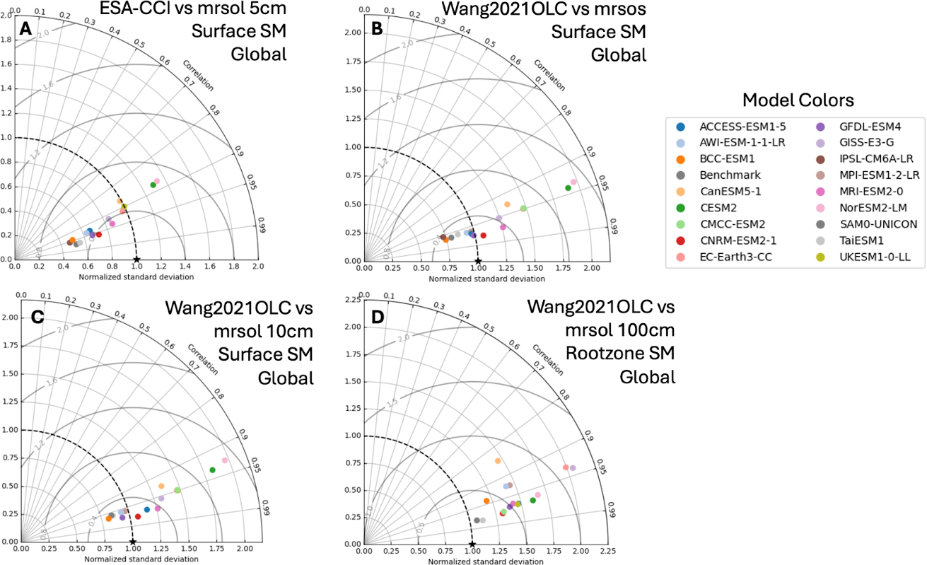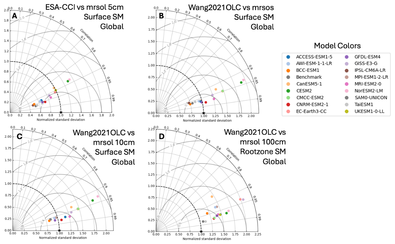 Figure 4Taylor diagrams evaluating the performance of CMIP6 model SM simulations compared to different observational datasets: (A) Surface SM from ESA-CCI (top 5 cm), (B) Wang2021OLC Surface SM using mrsos from the models (top 10 cm), (C) Wang2021OLC Surface SM using mrsol from the models (top 10 cm), and (D) Wang2021OLC Rootzone SM (top 100 cm).