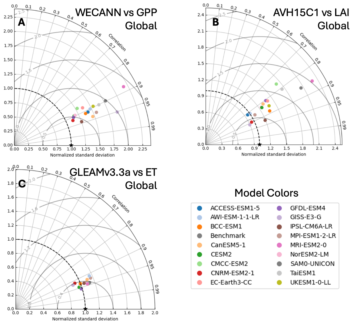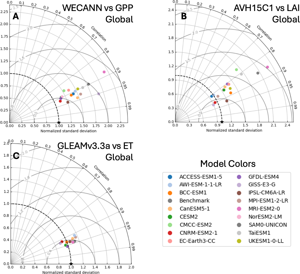 Figure 5Taylor diagrams evaluating the performance of CMIP6 models in simulating ecohydrologic variables: (A) Gross Primary Productivity (GPP) from WECANN, (B) Leaf Area Index (LAI) from AVH15C1, and (C) Evapotranspiration (ET) from GLEAMv3.3a.