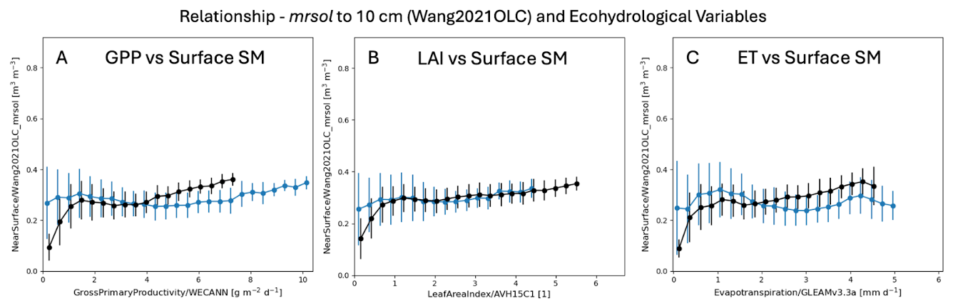 The relationship between soil moisture and ecohydrological variables provides a more stringent test of model behavior than evaluation of the individual variables alone. Figures 6 and 7 illustrate these relationships for the ACCESS-ESM1-5 model using two different observational surface SM products, based on monthly mean fields consistent with the temporal resolution of the analysis. The comparisons reveal that apparent agreement in individual variables does not necessarily translate into agreement in their coupled behavior, with notable differences emerging depending on the benchmark dataset and the depth of soil moisture considered.
