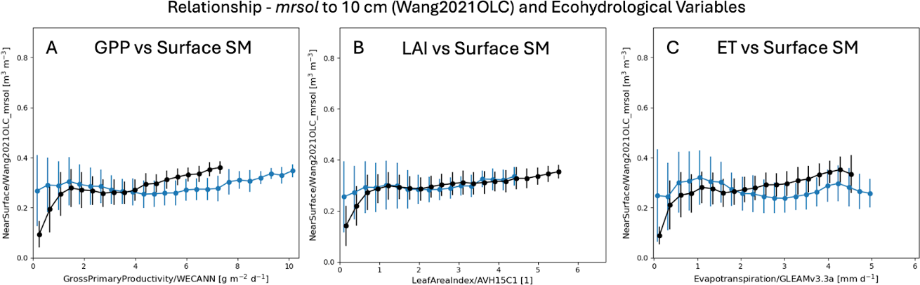 Figure 7Similar to Fig. 6, but using the Wang2021OLC SM product (integrated to 10 cm) and the corresponding ACCESS-ESM1-5 model SM at the same depth (mrsol to 10 cm). Dot-and-whisker plots show the relationship of soil moisture (y-axis) versus (a) WECANN GPP, (b) AVH15C1 LAI, and (c) GLEAMv3.3a ET for both model (blue) and observations (black) at the global scale. Whiskers represent interquartile ranges. Compared to Fig. 6, these plots demonstrate a marked reduction in discrepancies between modeled and observed relationships.