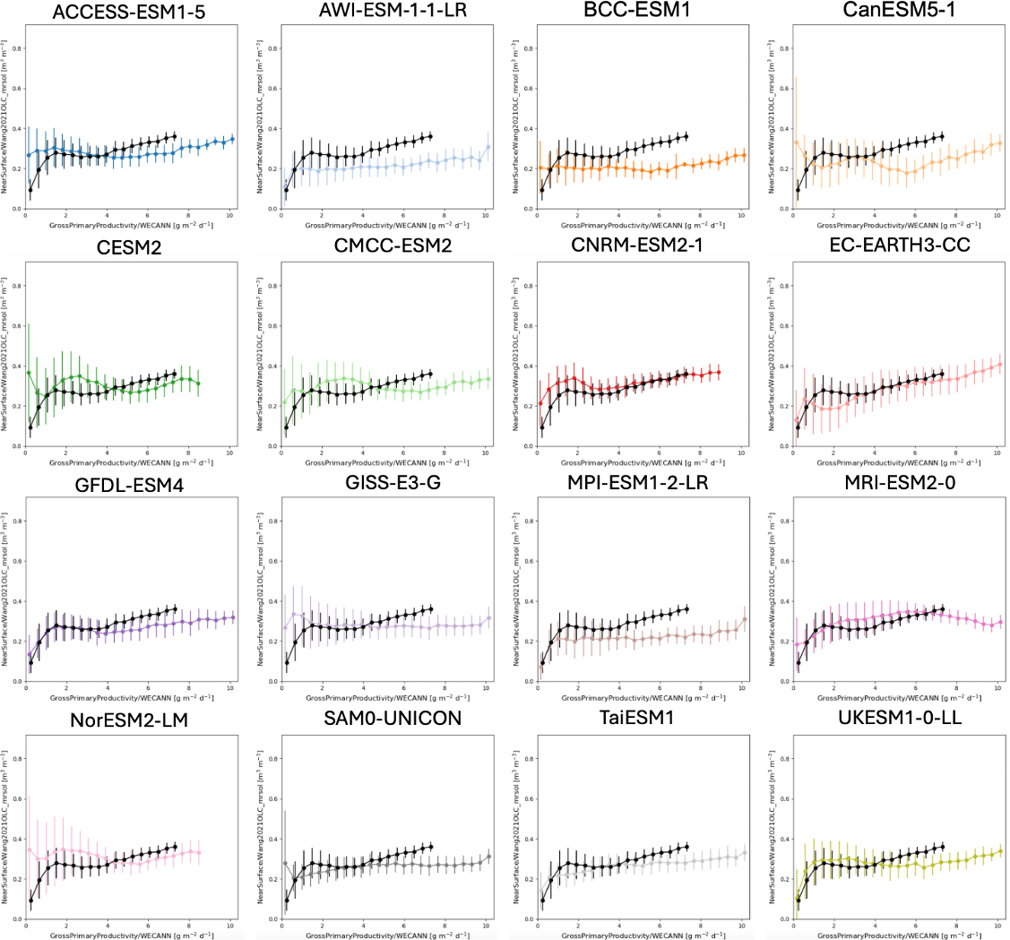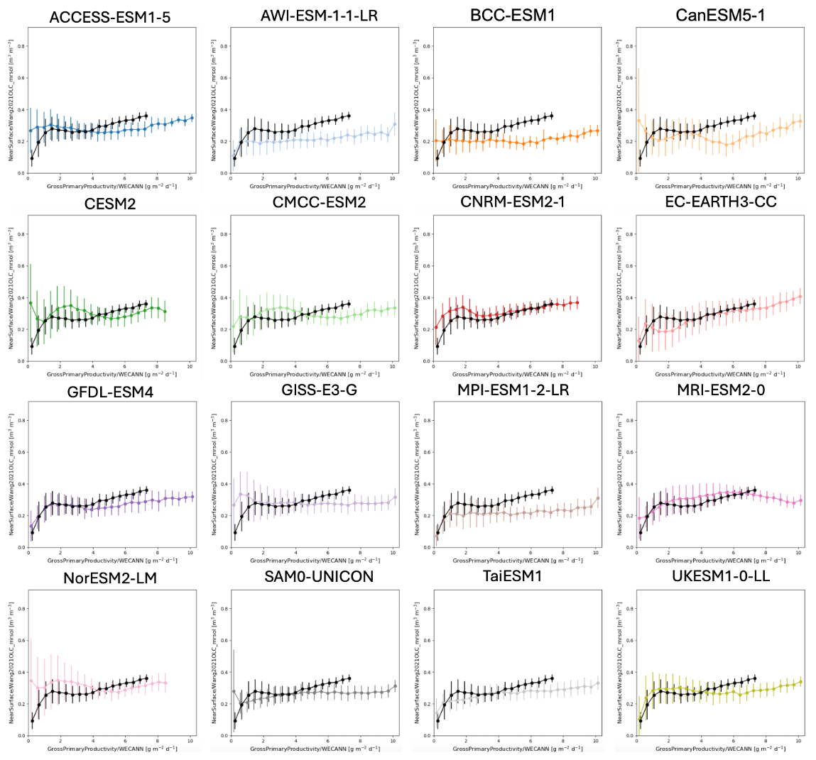 Figure 8Similar to the bias plots shown in Fig. 7A, but for all models. These plots highlight the observed relationships (black curves) between the surface SM (from the Wang2021OLC top 10 cm SM product) and GPP (from WECANN), as well as the relationship shown in each model (colored curves) using the simulated mrsol to 10 cm and gpp variables.