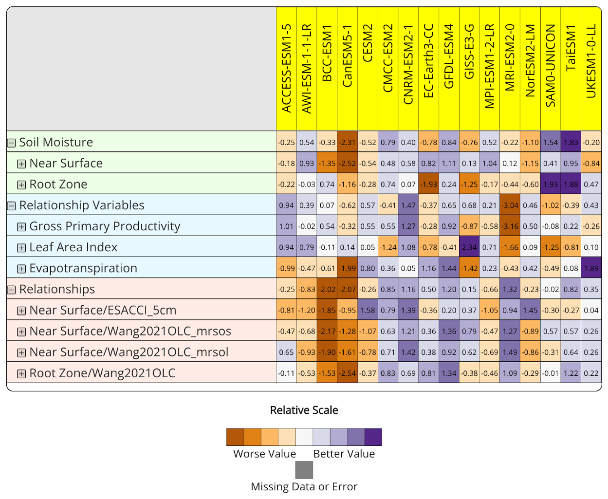 Figure 3Benchmarking results from the ILAMB global run. Each model is compared against observational datasets: ESA-CCI Surface SM [m3 m−3] (top 5 cm), Wang2021OLC Surface SM [m3 m−3] (top 10 cm), Wang2021OLC Rootzone SM [m3 m−3] (top 100 cm), WECANN GPP [g m−2 d−1 ], AVH15C1 LAI [unitless], and GLEAMv3.3a ET [mm d−1 ]. Additionally, the relationships between soil moisture and ecohydrological variables (GPP, LAI, and ET) are also benchmarked. Purple represents better relative skill, while orange indicates relatively worse performance.