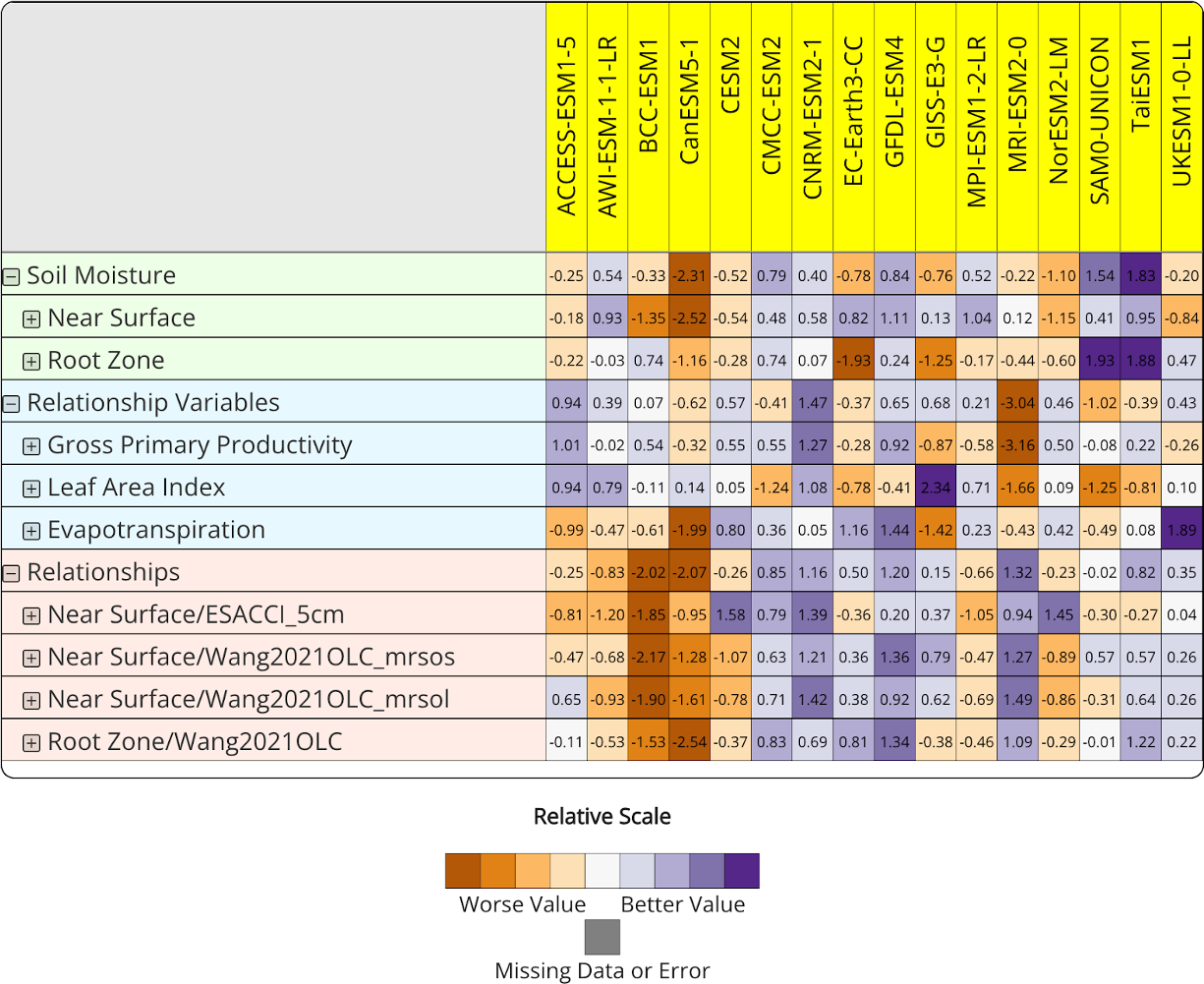 Notably, models based on the same land surface framework tend to exhibit similar performance signatures (e.g., CESM2 and NorESM2-LM using CLM5, and MPI-ESM1-2-LR and AWI-ESM-1-1-LR using JSBACH; see Table A1). This structural coherence suggests that differences in land model formulation play an important role in shaping benchmarking outcomes, motivating a more detailed examination of soil moisture, ecohydrological variables, and their coupling in the following subsections. We note that comparable process-level documentation is not always consistently available across all CMIP6 models; therefore, Table A1 summarizes key characteristics only for those models for which this information is clearly documented in the literature, and the absence of entries for some models reflects limitations in publicly available documentation rather than an exhaustive comparison.
