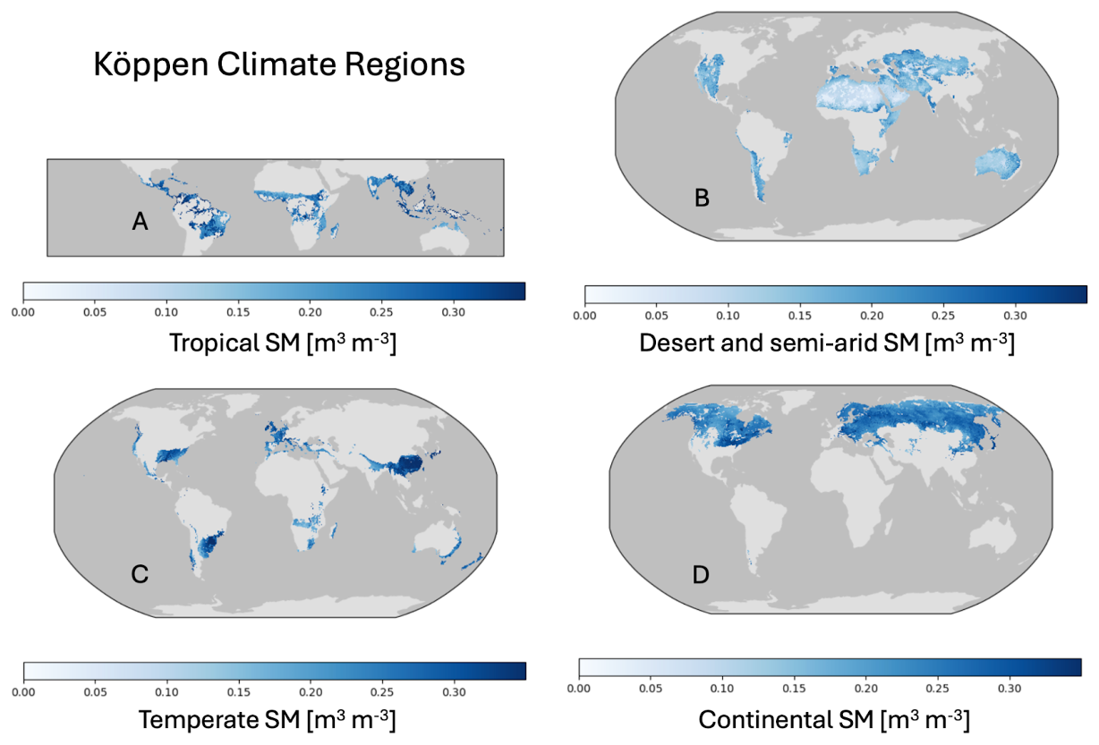 Figure A4Köppen climate regions evaluated in this study through ILAMB. The default region is “global”, while other regions include (A) Tropical, (B) Desert and Semi-arid, (C) Temperate, and (D) Continental. Regional mean values of surface SM derived from the ESA-CCI product are shown. The ESA-CCI dataset includes some data gaps, particularly in densely forested regions (e.g., the Amazon and Congo), ice-covered areas, and urban zones, due to limitations in microwave satellite observations. These gaps are more prevalent in earlier years and become less frequent over time. However, the primary purpose of this figure is to broadly illustrate the Köppen climate regions rather than serve as a detailed analysis of SM.