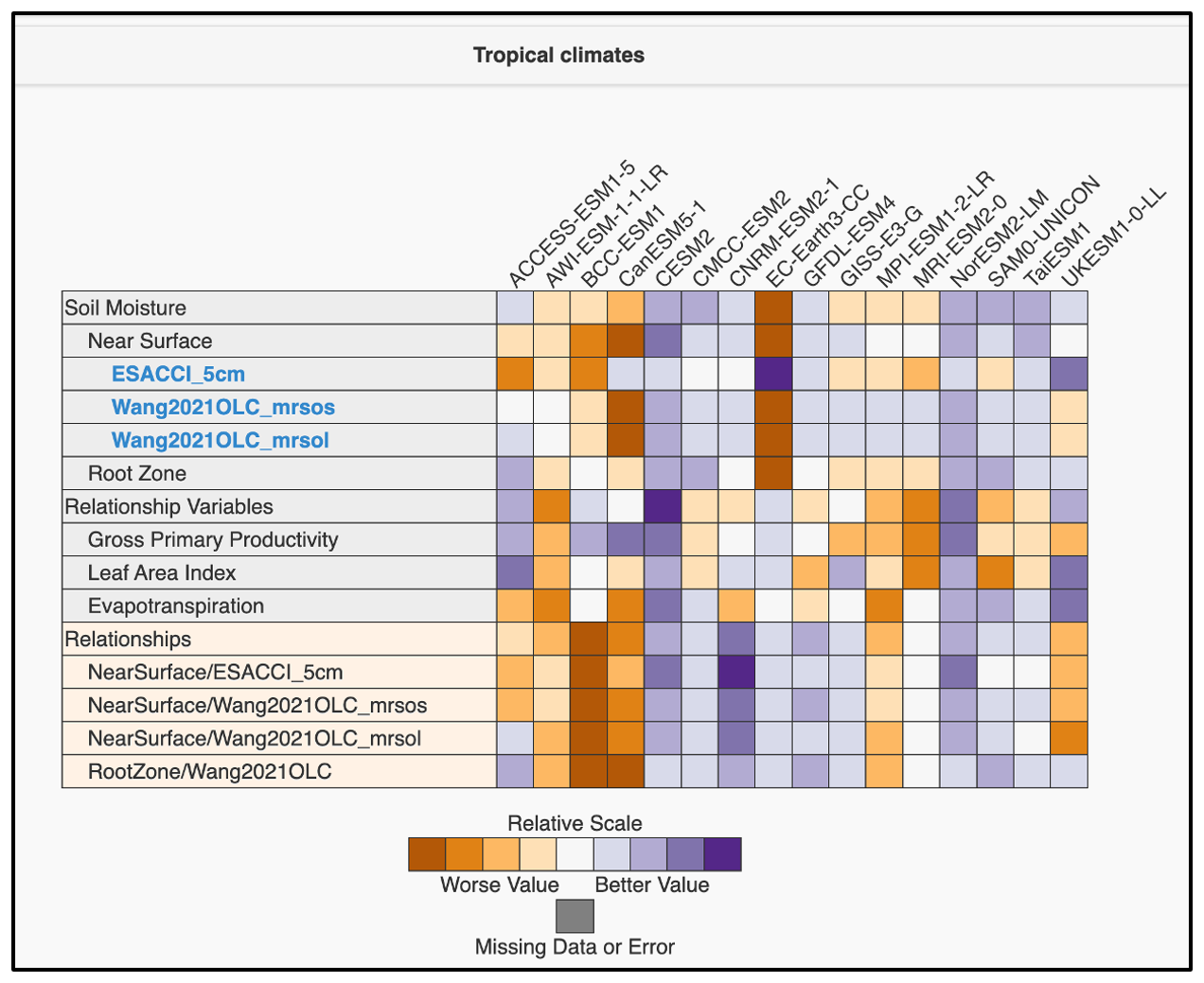 In the Tropical region (Figs. A5–A6), CLM5-based models (CESM2 and NorESM2-LM) exhibit consistently high skill across soil moisture, ecohydrological variables, and their relationships, indicating coherent performance in energy- and water-rich environments. In contrast, JSBACH-based models (MPI-ESM1-2-LR and AWI-ESM-1-1-LR) show systematically weaker performance across many of these diagnostics, while UKESM1-0-LL (JULES) exhibits mixed behavior, with relatively stronger performance for rootzone SM and surface fluxes but weaker performance for surface SM and GPP. These patterns suggest that model differences that are muted in global averages can become more pronounced when evaluated in climate regimes dominated by deep rooting, strong transpiration control, and tight soil–vegetation coupling.