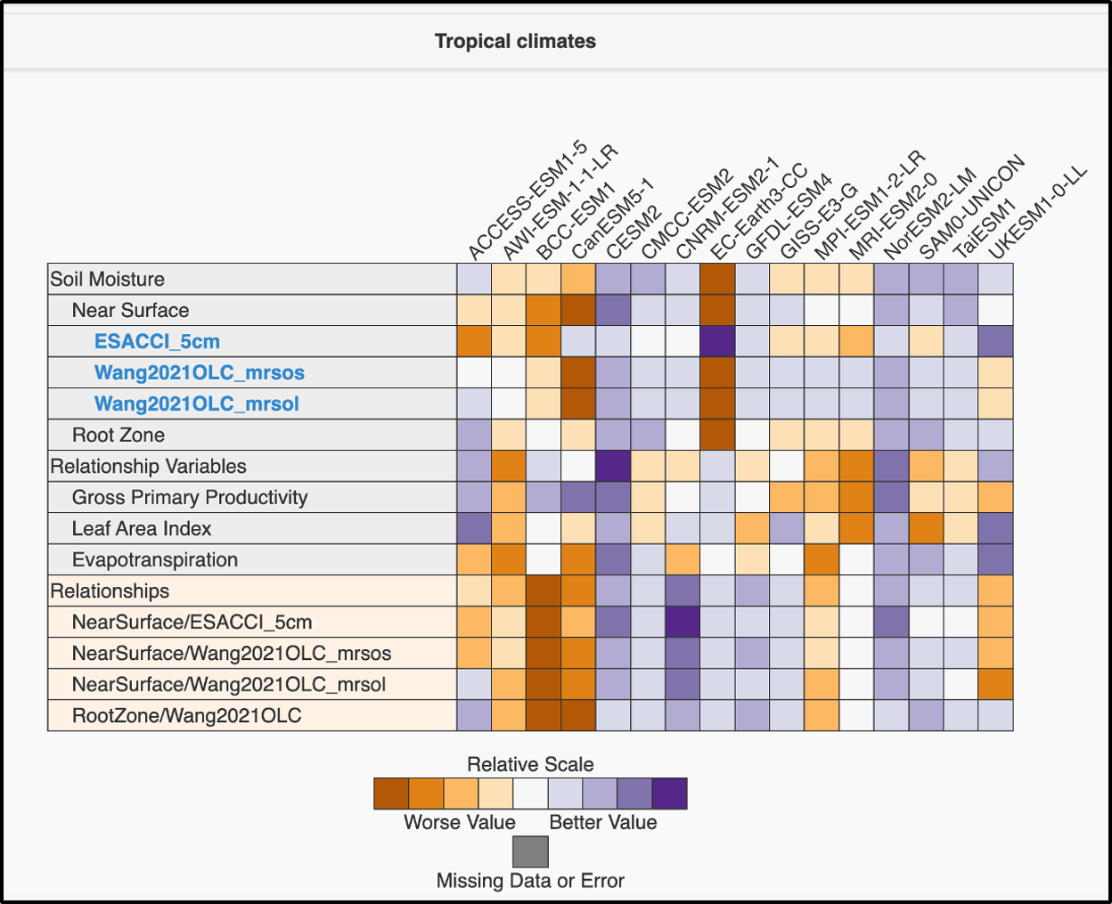 Figure A5ILAMB results similar to Fig. 3, but for the “Tropical” Köppen region.