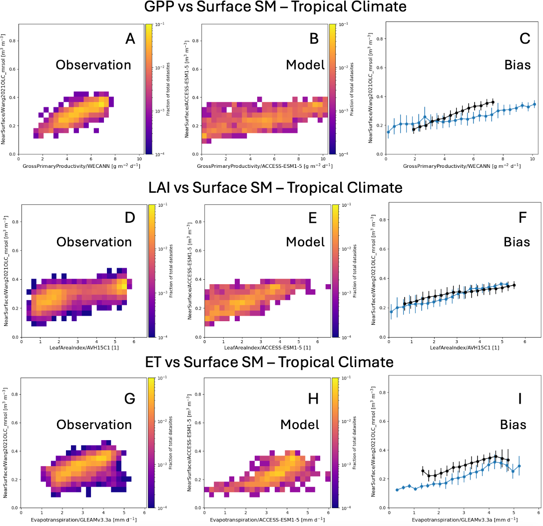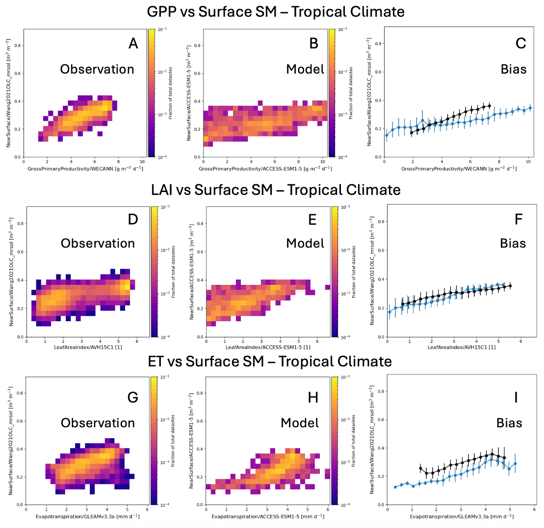 Figure A6Relationships between surface SM and ecohydrologic variables, similar to Fig. 7, but for the “Tropical” Köppen region. The model results shown here are for the ACCESS-ESM1-5 model. Panels (A), (D), and (G) show the heat maps of the observed relationships, panels (B), (E), and (H) show the heat maps of simulated relationships in the ACCESS-ESM1-5 model, and panels (C), (F), and (I) portray both the observed and simulated relationships in the form of dot and whisker plots for easy comparison.