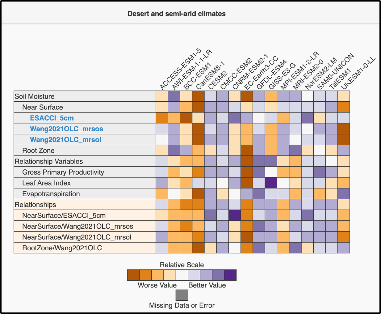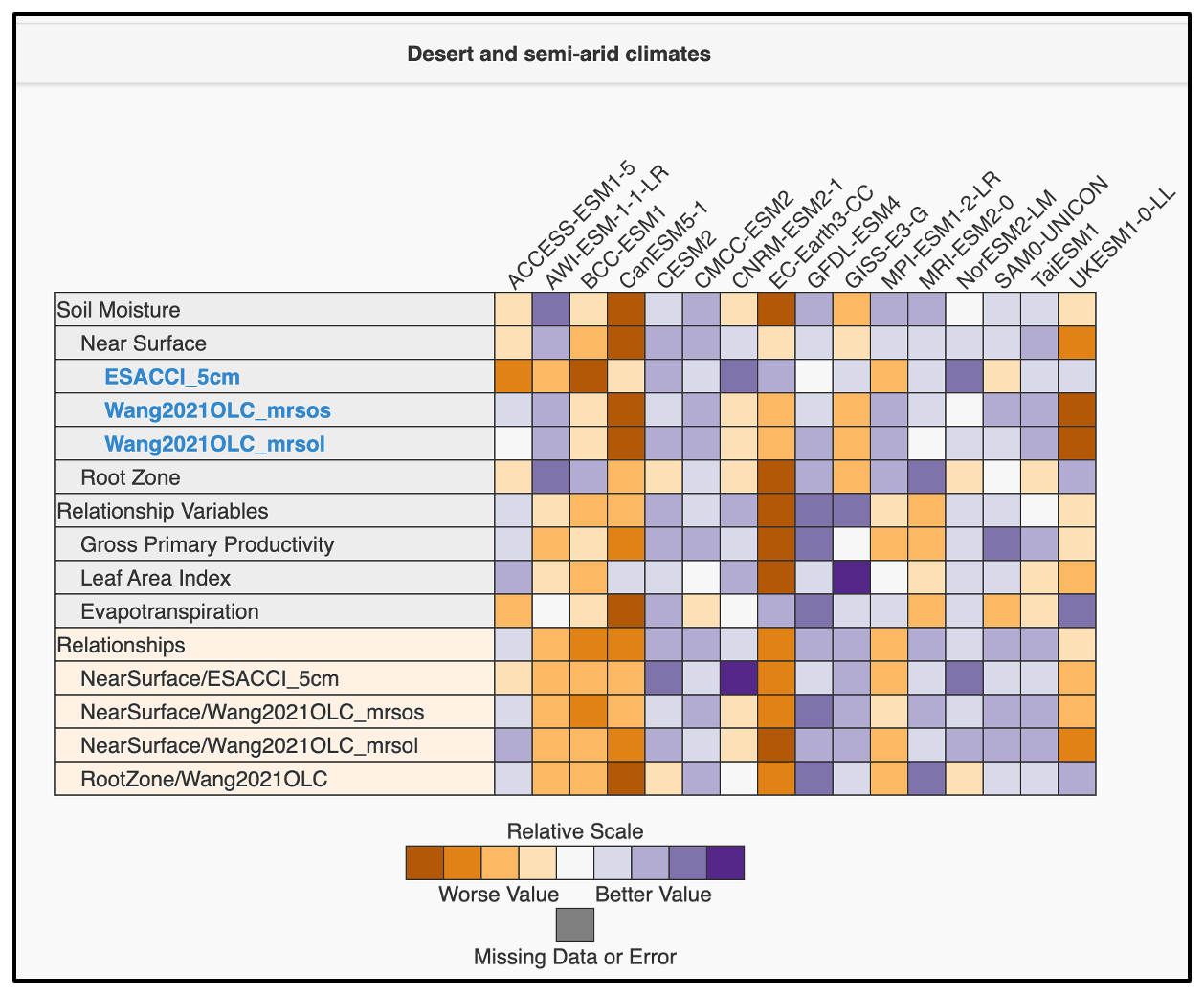 In Desert and Semi-arid regions (Fig. A7), CLM5-based models again show generally strong performance across most variables, although skill in rootzone SM is reduced, leading to weaker coupling metrics involving deep soil moisture. JSBACH-based models tend to perform relatively well for soil moisture states but less well for ecohydrological variables, resulting in degraded coupling diagnostics. UKESM1-0-LL again shows mixed behavior, with relatively strong performance for rootzone SM and ET but weaker performance for surface SM and GPP, and correspondingly weaker coupling metrics. These results highlight that in water-limited environments, differences in how soil moisture anomalies propagate into vegetation and flux responses become particularly important.