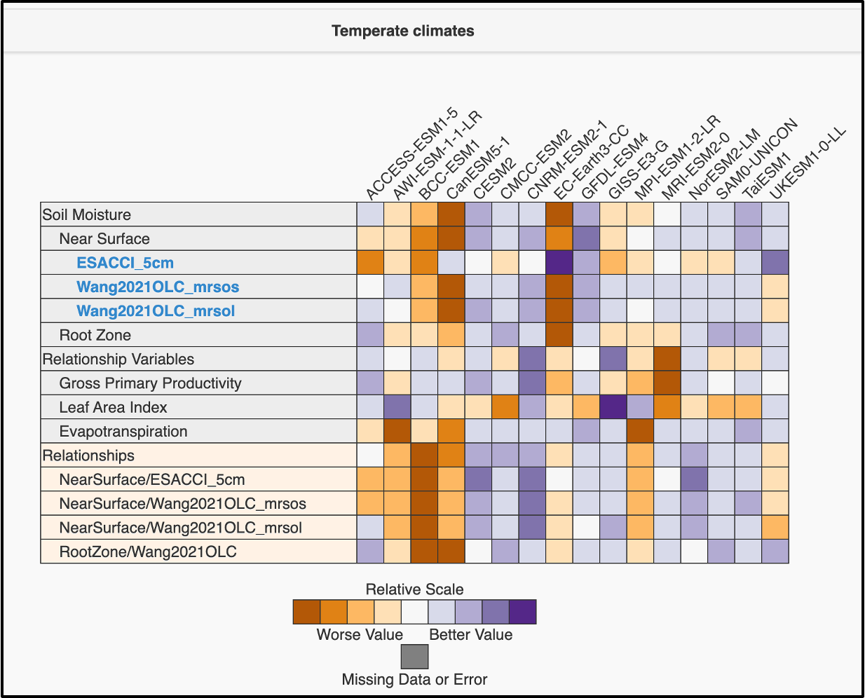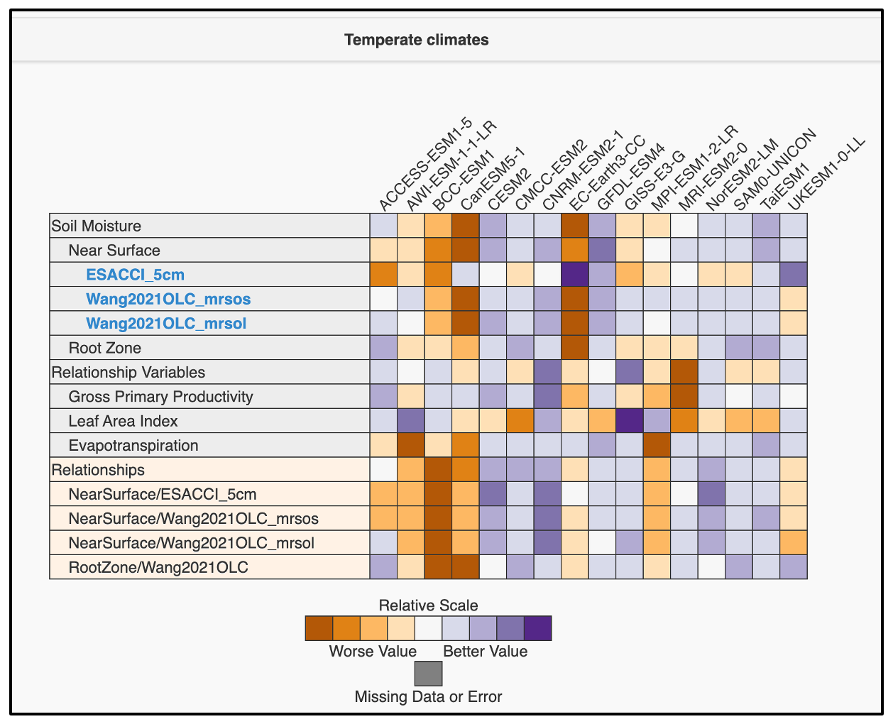 Figure A8ILAMB results similar to Figs. 3 and A5, but for the “Temperate” Köppen region.
