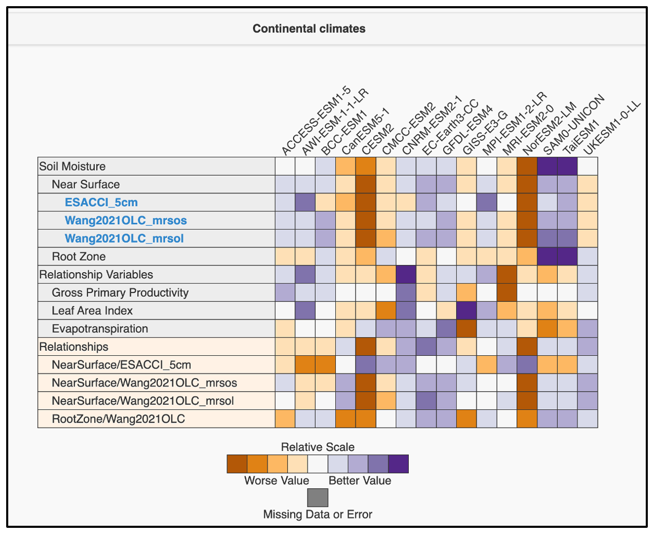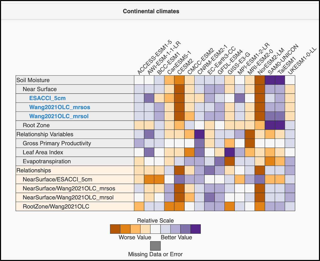 The Continental (high-latitude) region (Fig. A9) shows the most pronounced divergence among models. Here, CLM5-based models exhibit markedly degraded performance across soil moisture, ecohydrological variables, and their relationships, likely reflecting the strong influence of cold-region processes such as organic soils, freeze–thaw dynamics, and high soil porosity, which lead to substantially higher simulated soil moisture than indicated by current observational products. In contrast, JSBACH-based models show relatively good performance for surface SM and ecohydrological variables but weaker performance for rootzone SM, resulting in depth-dependent differences in coupling skill. These results demonstrate that high-latitude regions pose distinct challenges for both observations and models, and that process representations that improve performance in one climate regime may degrade it in another.
