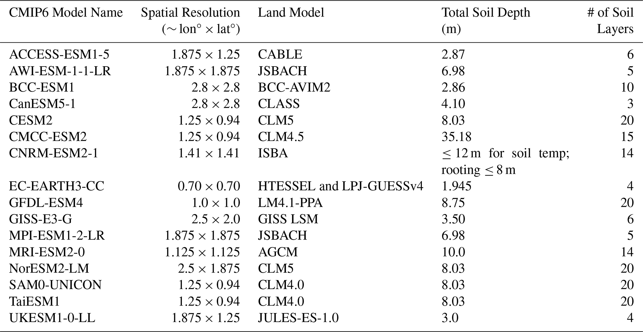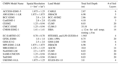 Table 1CMIP6 models used in this study, along with their latitude and longitude grid sizes and the land models with their soil depths and number of soil layers used in each model.