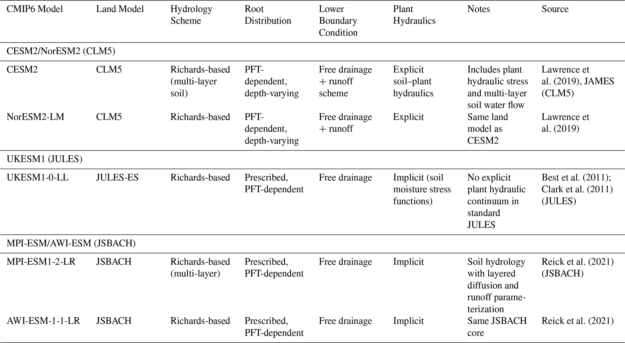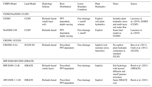 Table A1Overview of key land surface process representations for some of the selected CMIP6 models used in this study, including hydrology scheme, root distribution, lower boundary condition, and treatment of plant hydraulics. This table provides structural context for interpreting differences in soil moisture, ecohydrological variables, and their coupling across models. Sources for each entry are listed in the table. Because process-level documentation is not consistently available for all CMIP6 models, this table summarizes key characteristics only for models with clearly documented information in the literature.