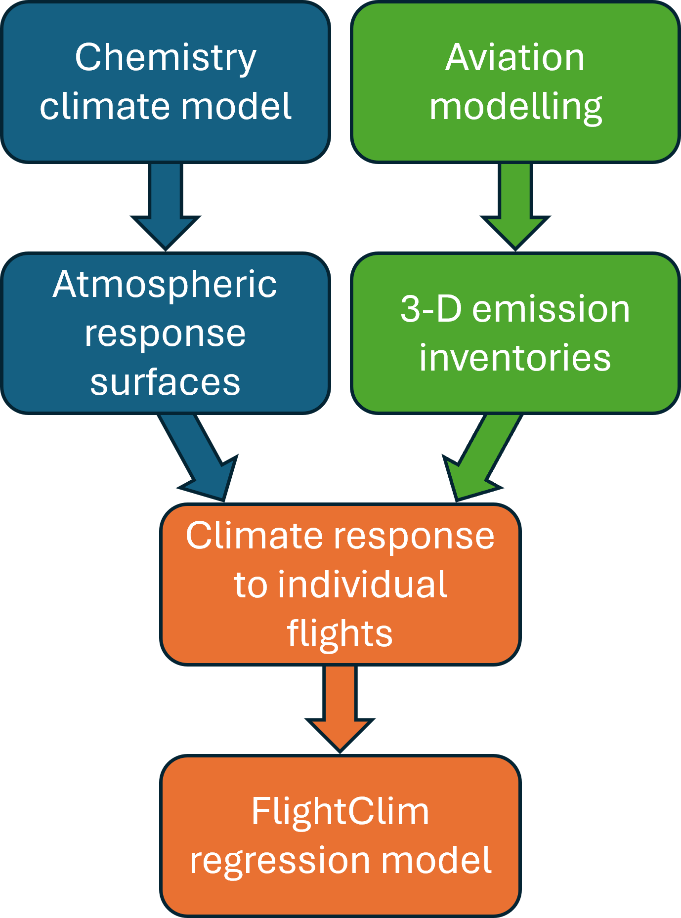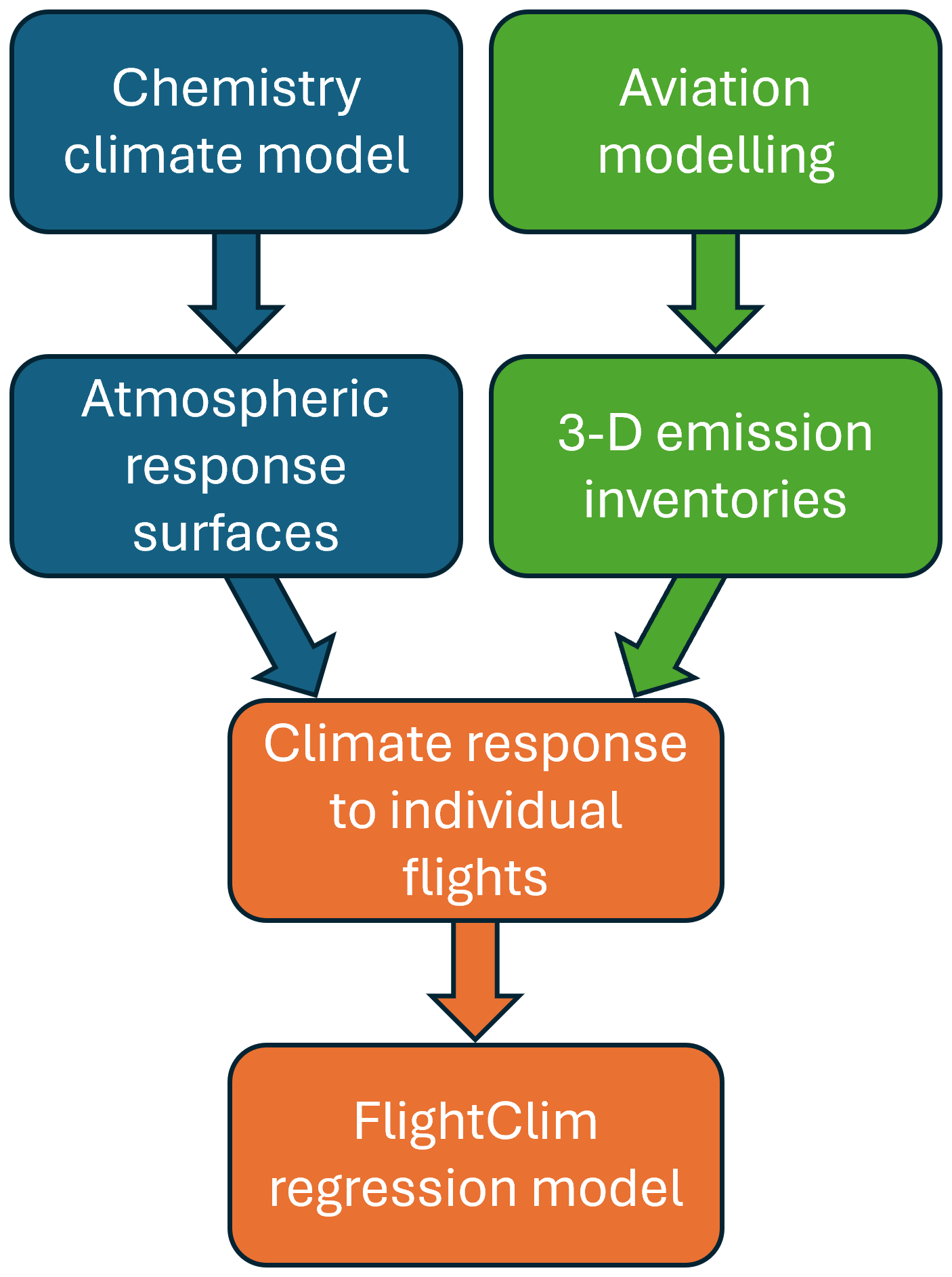 The method is based on the combination of atmospheric climate response surfaces, that are derived from chemistry-climate model simulations, and a detailed 3-D aviation emission inventory for a full year. From those AirClim estimates the individual flights' climate response that serves as the regression database. The derived FlightClim regression models are route and aircraft specific parametrisations of the flight-specific climate effects. The described modeling workflow is depicted in Fig. 1.