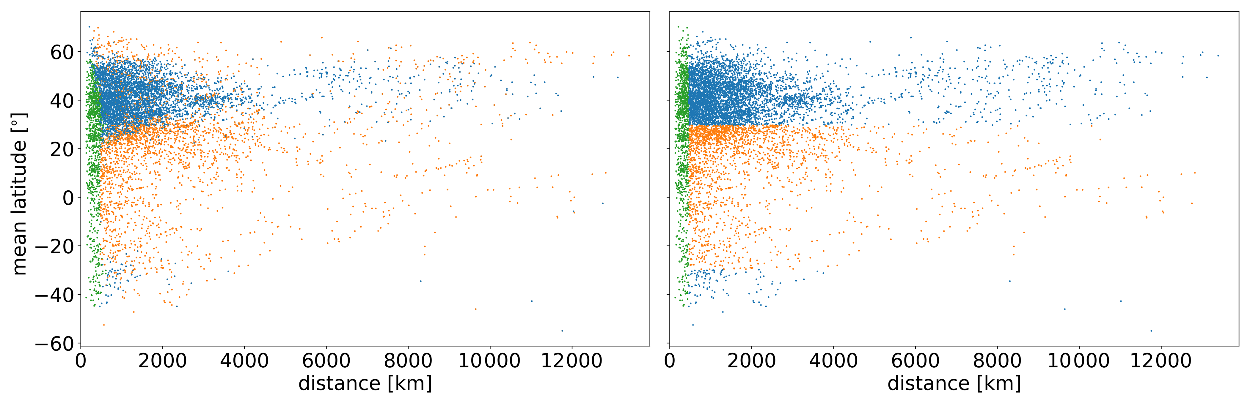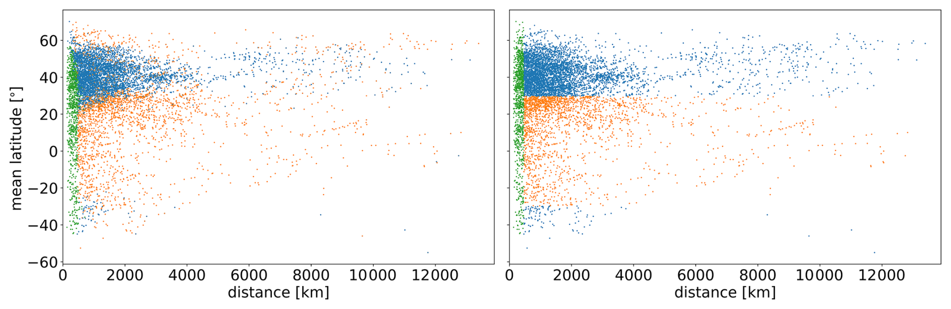 Figure 2Clustering of flights, as obtained by the K-Means clustering algorithm (left) and as delineated by simple thresholds (right), shown in the mean latitude–distance space. Each color corresponds to one cluster. We name them the short-flight cluster (green), the tropical cluster (orange), and the mid-latitude cluster (blue).
