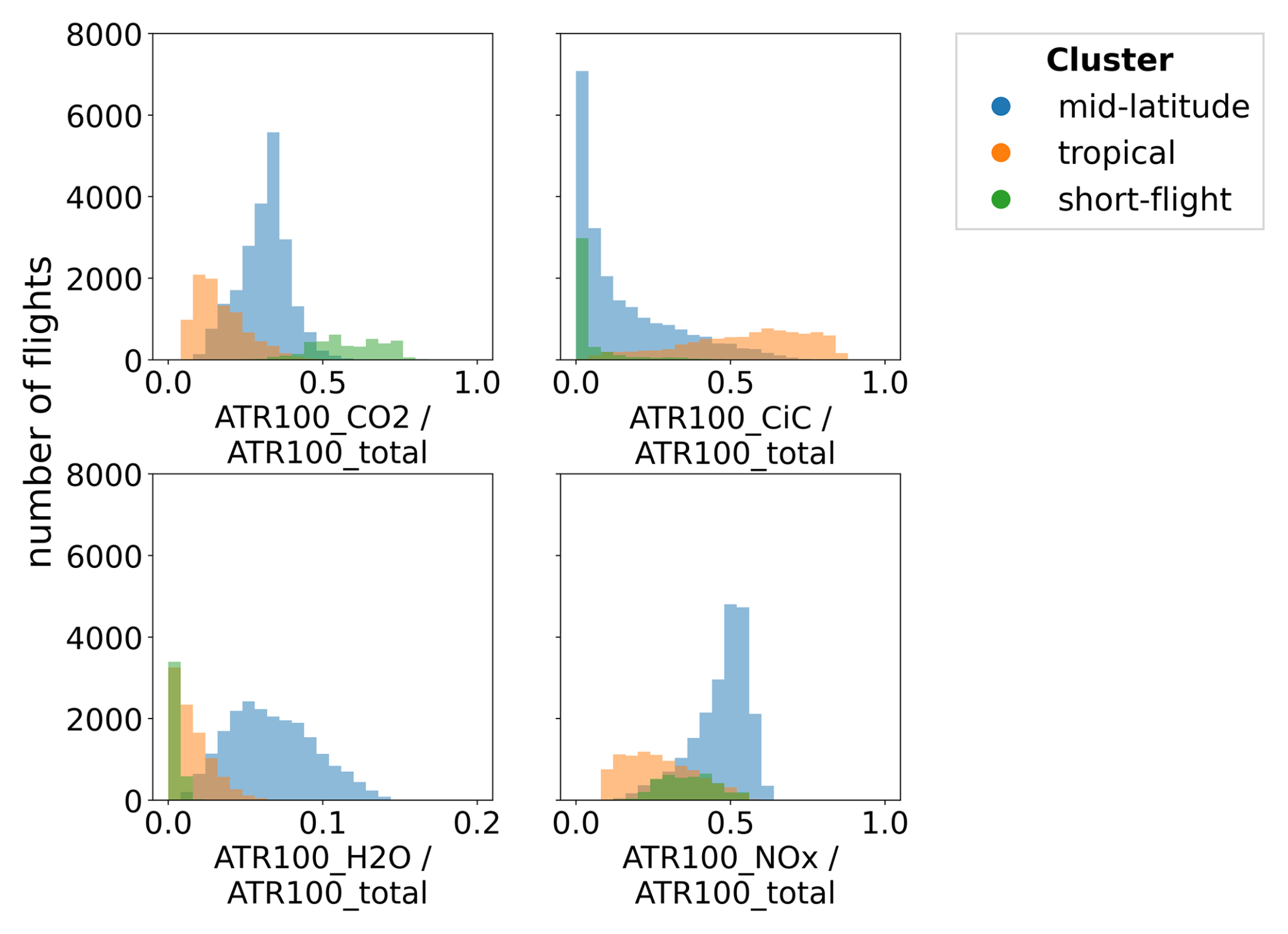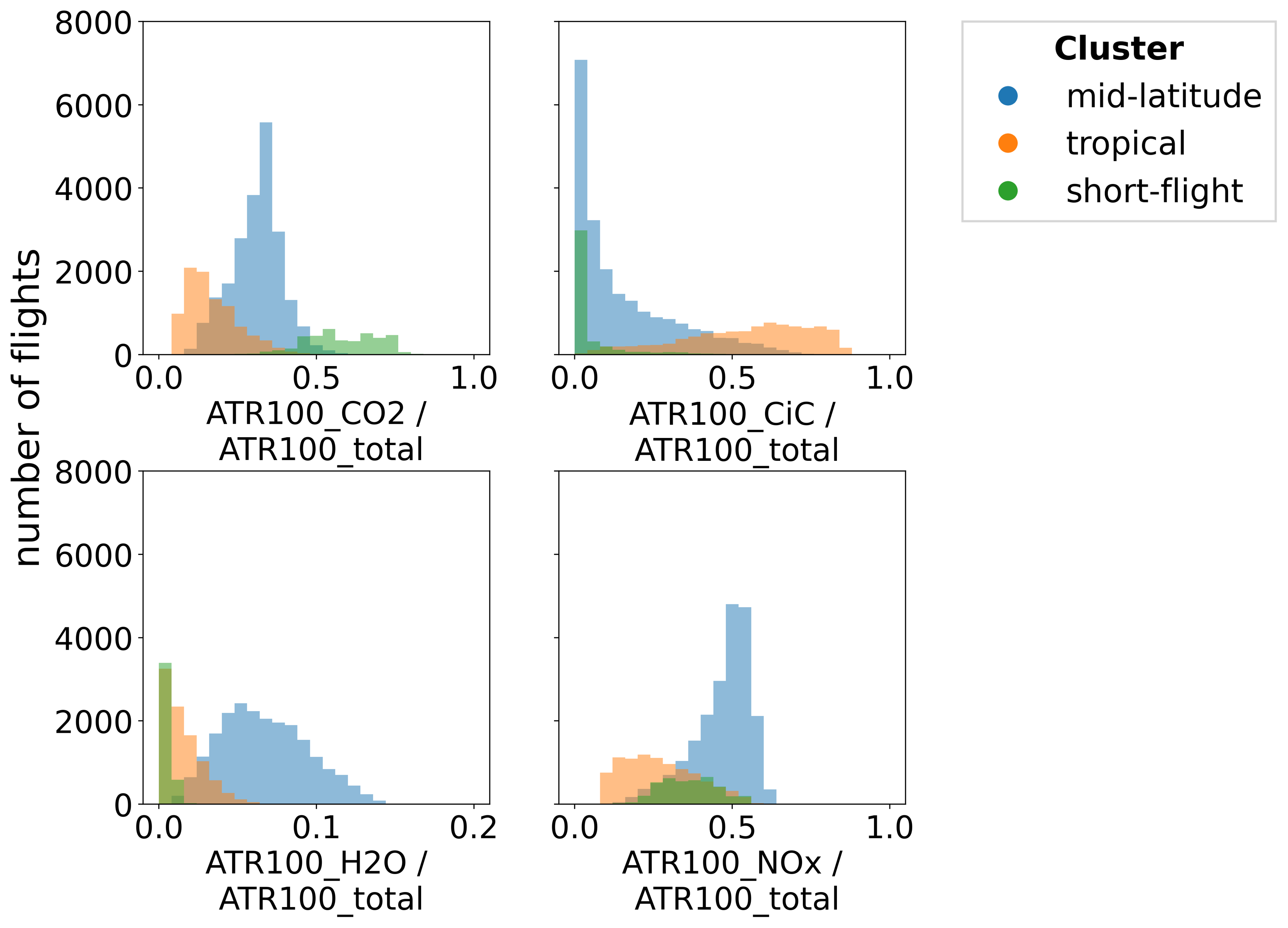 Figure 3Number of flights as function of ratio of the individual climate effect components (CO2, CiC, H2O, and NOx) to the total climate effect for the 3 flight clusters.