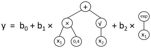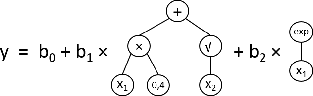 The Symbolic Regression method used here, avoids a pre-defined structure of the formula. Instead an evolutionary algorithm provides a best fit and thereby defines the structure of the formulas. This structure can be represented by an expression tree, called gene. Each node in the gene represents a variable, a mathematical operation or a constant. The nodes are merged to a formula by the tree structure (Koza1992). The tool we apply, GPTIPS 2 (Searson2015), specifically uses Multi-Gene Symbolic Regression, which combines multiple genes with an additional scaling factor per gene (b1, b2) and a bias term (b0) to assemble the whole formula (Fig. 4).