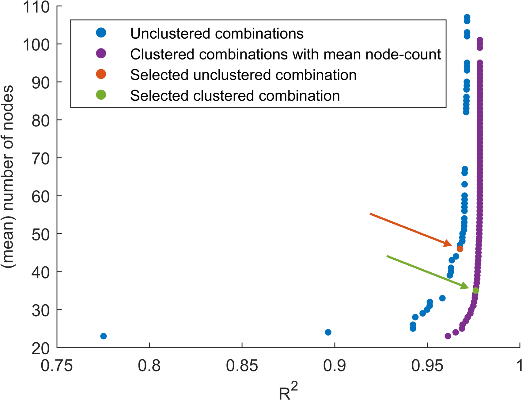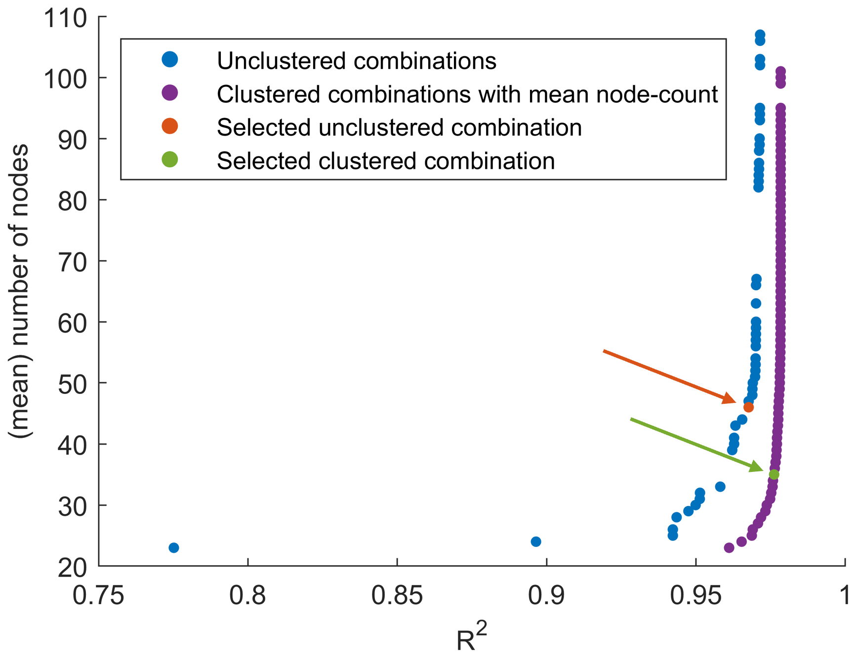 From all derived formulas the Pareto-optimal individuals according to the coefficient of determination R2 (Eq. 3) and the number of nodes are considered as candidates for the final formula of the species and cluster (see Sect. S3.1). To obtain one formula for the total climate effect the formulas for CO2, H2O, CiC and NOx have to be combined according to Eq. (1). In this step the numbers of nodes for the ATR100tot add, but the quality of estimation measured as R2 has to be newly computed. It is not apparent, which Pareto-formula to choose for each species to achieve an optimum in estimation quality and number of nodes for ATR100tot. However, by trying all combinations it is possible to identify Pareto-optimal combinations that represent a optimal trade-off between a high value of R2 and a low number of nodes. Figure 5 shows these ATR100tot-Pareto-fronts for the unclustered (blue) and the aggregated clustered version (purple; for the individual clusters please see Fig. S10). The final choices made are indicated by red and green dots. The selected formulas are given in Sect. S3.1.