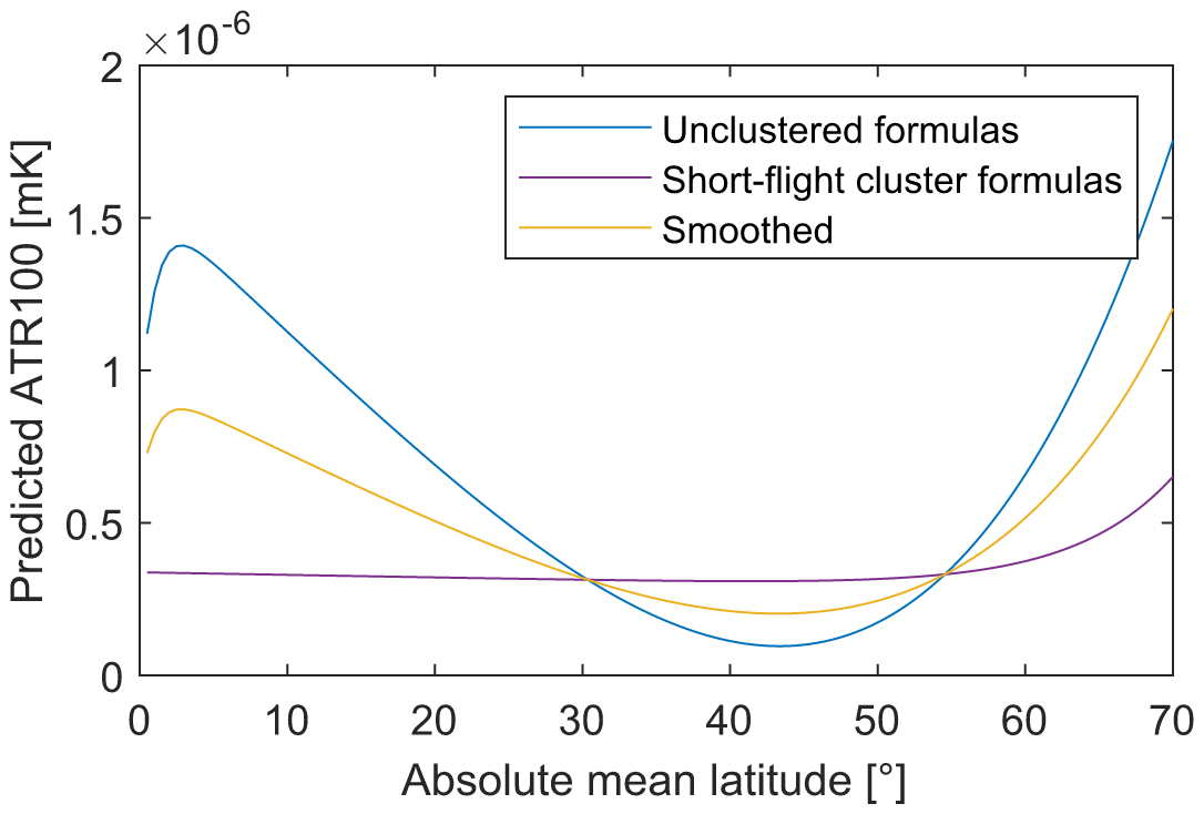 For ATR100tot in the short-flight cluster the clustered approach shows a significantly better estimation quality than the unclustered one (see Fig. S11). For the two other clusters the quality is comparable. Therefore as a combination of low complexity and a high quality of estimation the clustered formulas are applied for flights in the short-flight cluster in the further analysis and the unclustered formulas are used for mid-latitude and tropical cluster flights.