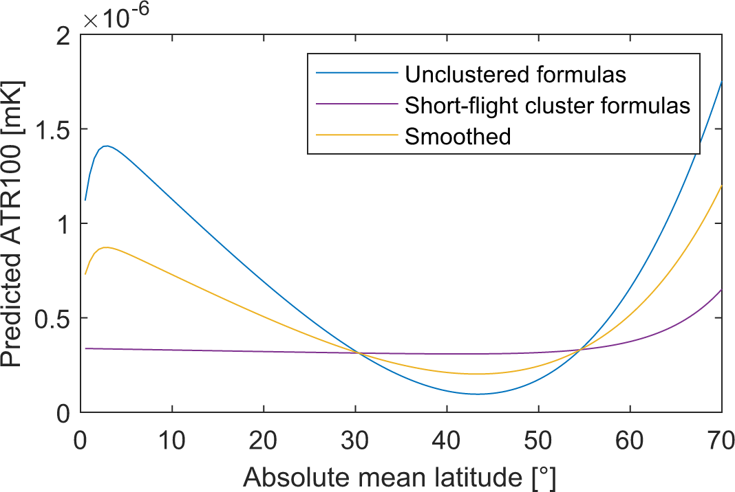 Figure 6ATR100 estimates for flights with an Airbus A320 over the cluster boundary distance of 462.5 km depending on the mean latitude. The plot shows the estimation with the unclustered SR-formulas, the formulas for the short-flight cluster as well as the smoothed version, taking the mean of the partially largely differing estimates.