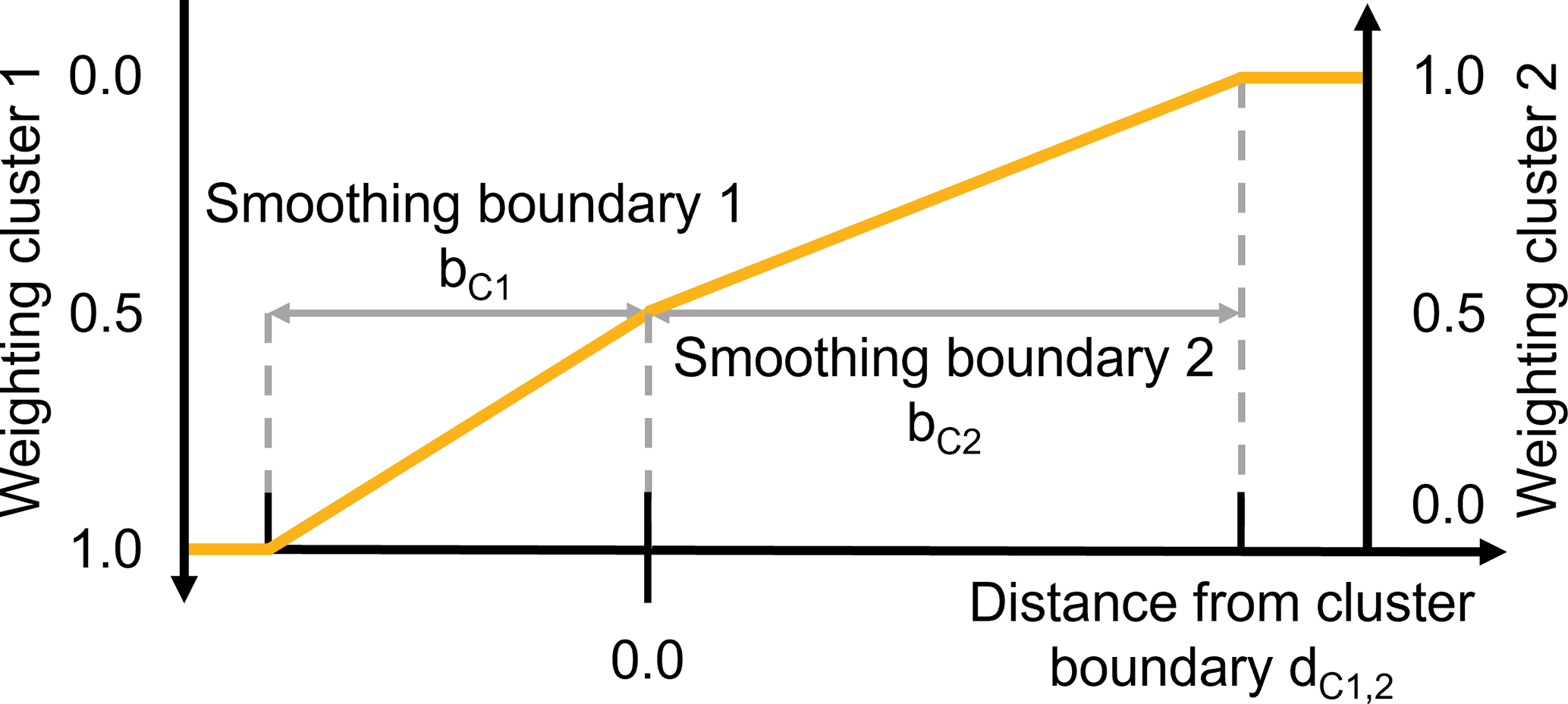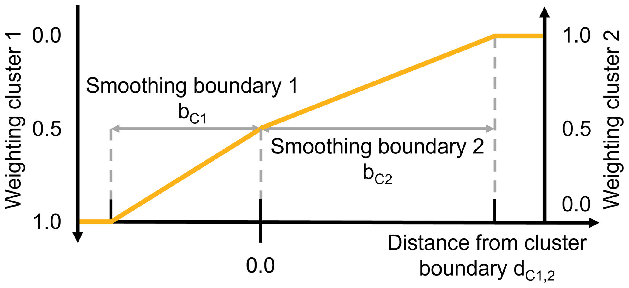 Figure 7Concept for smoothing of regression results at cluster boundaries. The smoothing takes place linearly in a predefined range (smoothing boundary) on both sides of the cluster boundary.