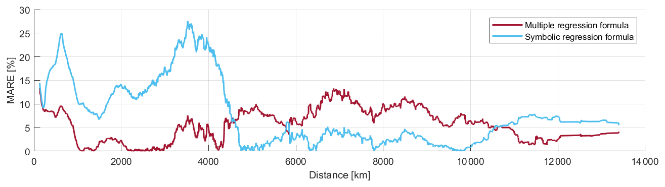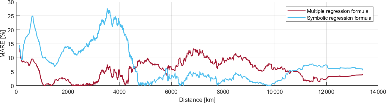 Figure 8Trend comparison of the MARE for the ATR100tot estimation with the Multiple and Symbolic Regression approach over the flight distance.